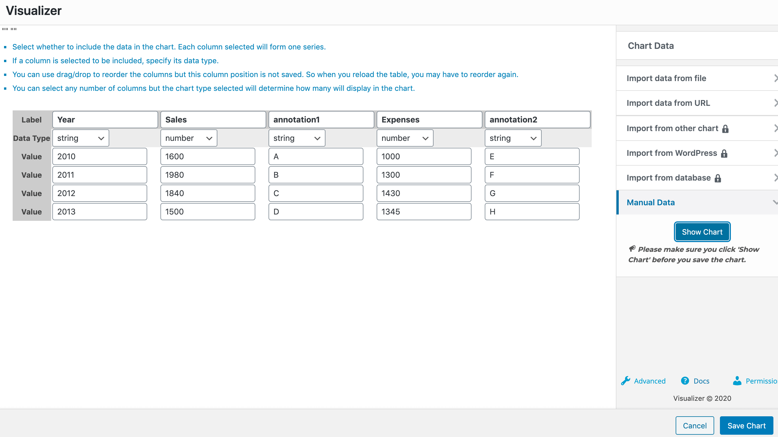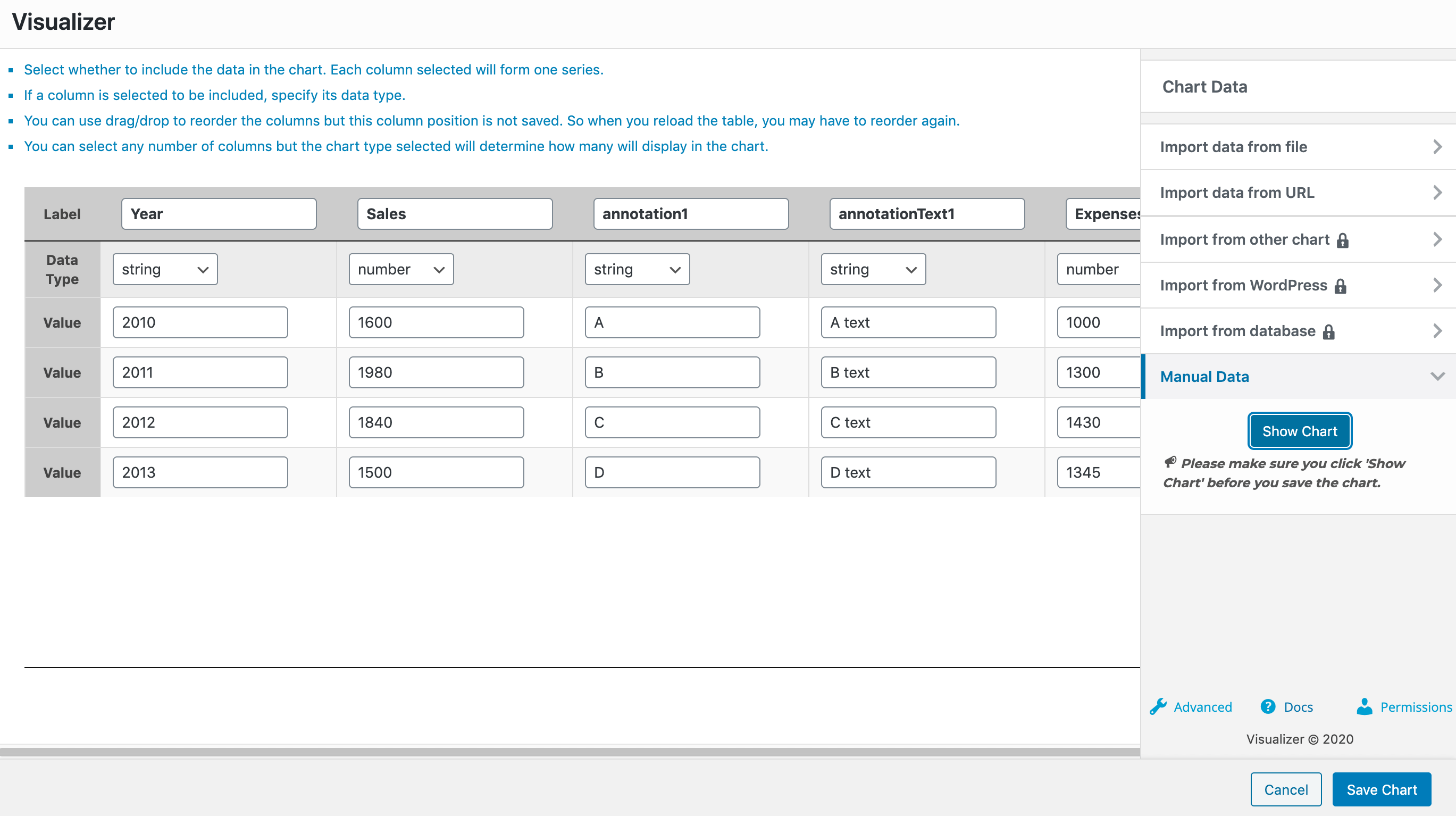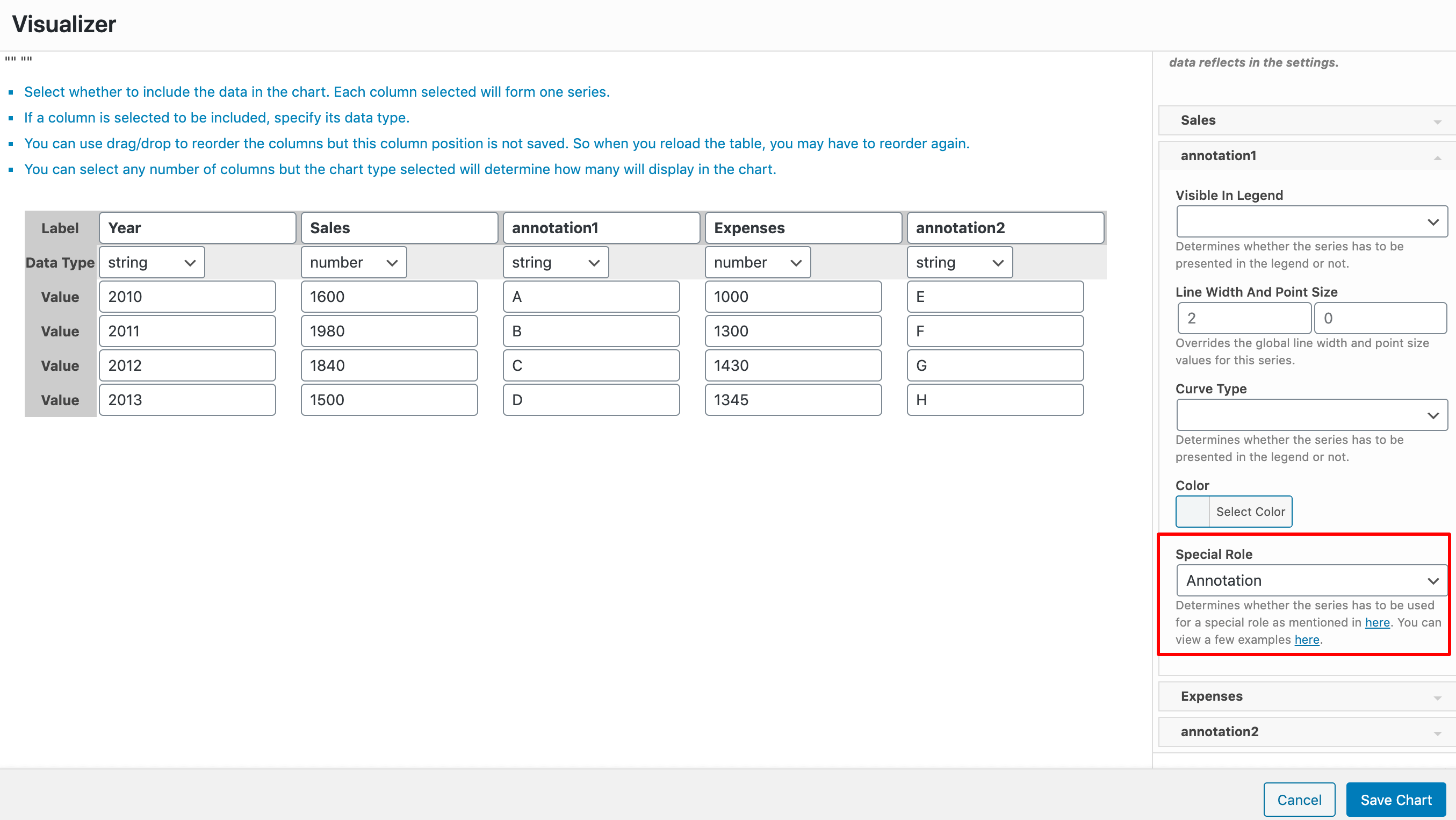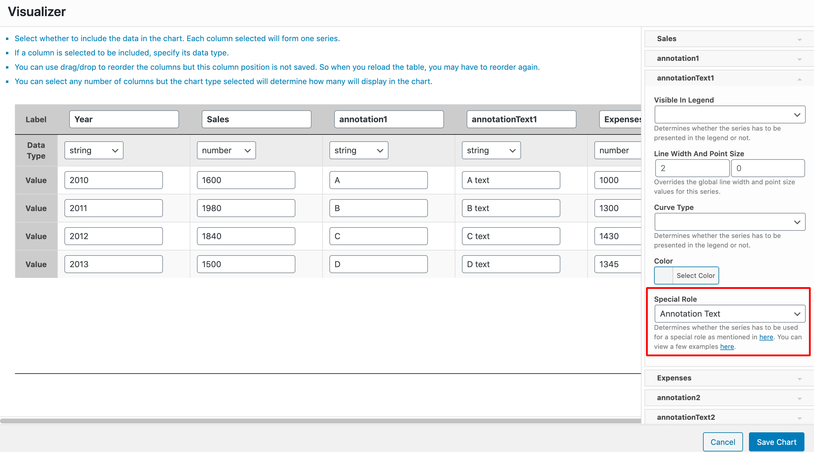For this example, we have a line chart, with three columns Year ( of type string ), Sales ( of type number ), and Expenses ( of type number ). After each of the Sales and Expenses columns, we have a dedicated column we've named Annotation ( of type string ) which is used as the annotation column of the chart. For that to happen, you must go to the Advanced tab > Series Settings > Select each of the Annotation columns and for them choose the Annotation Special Role.