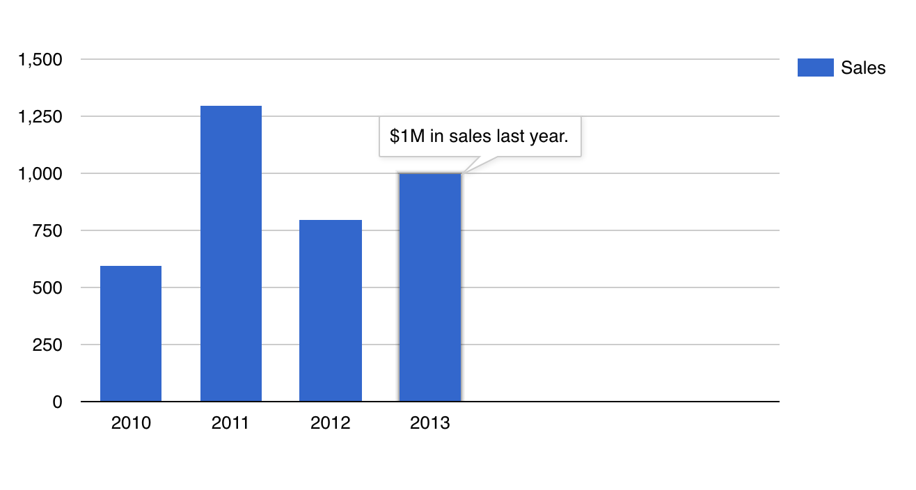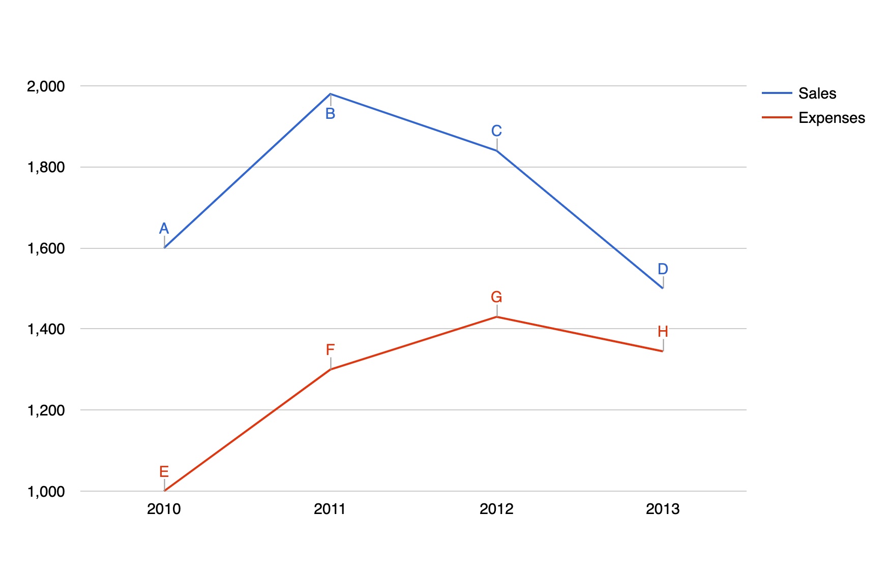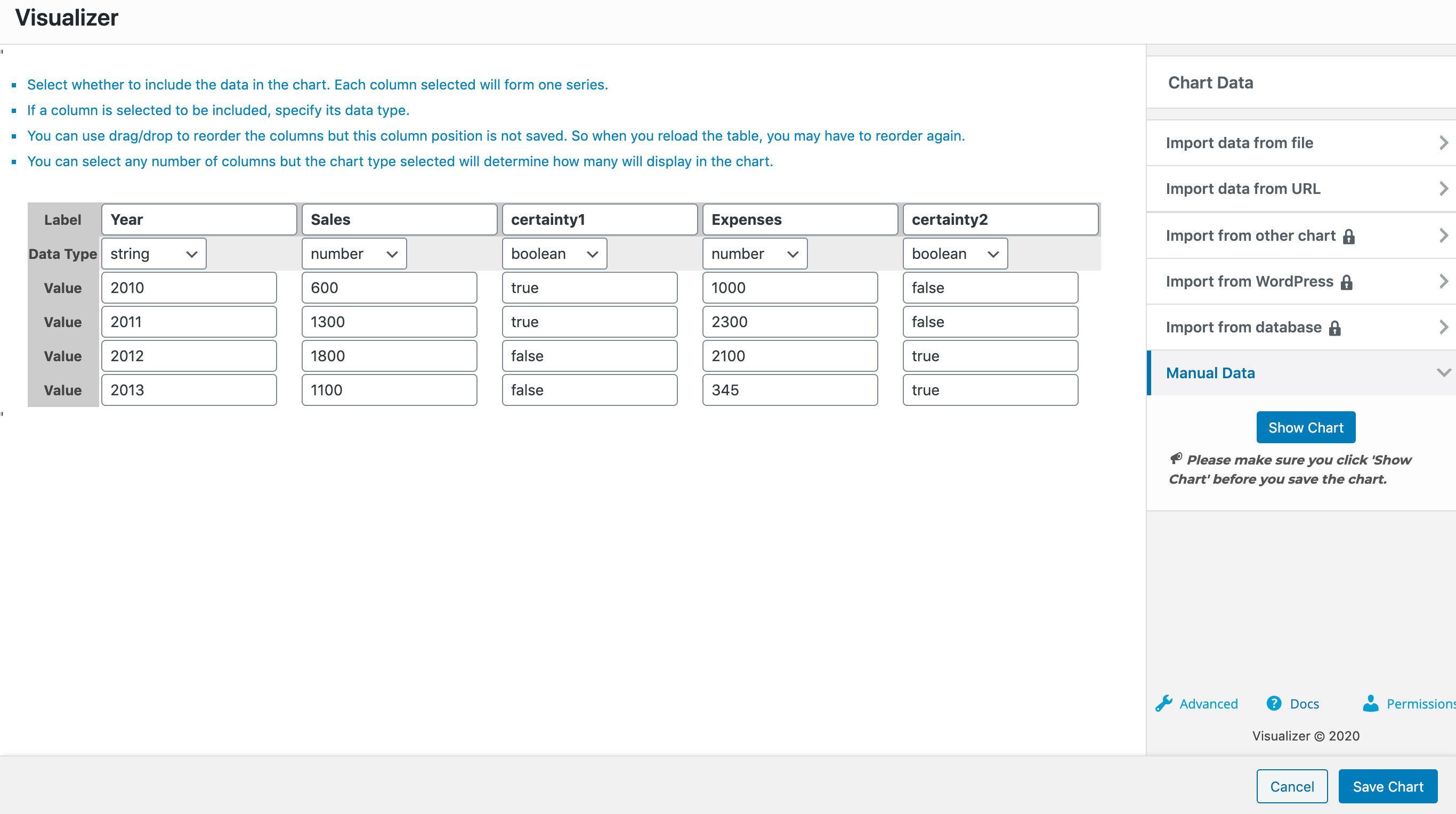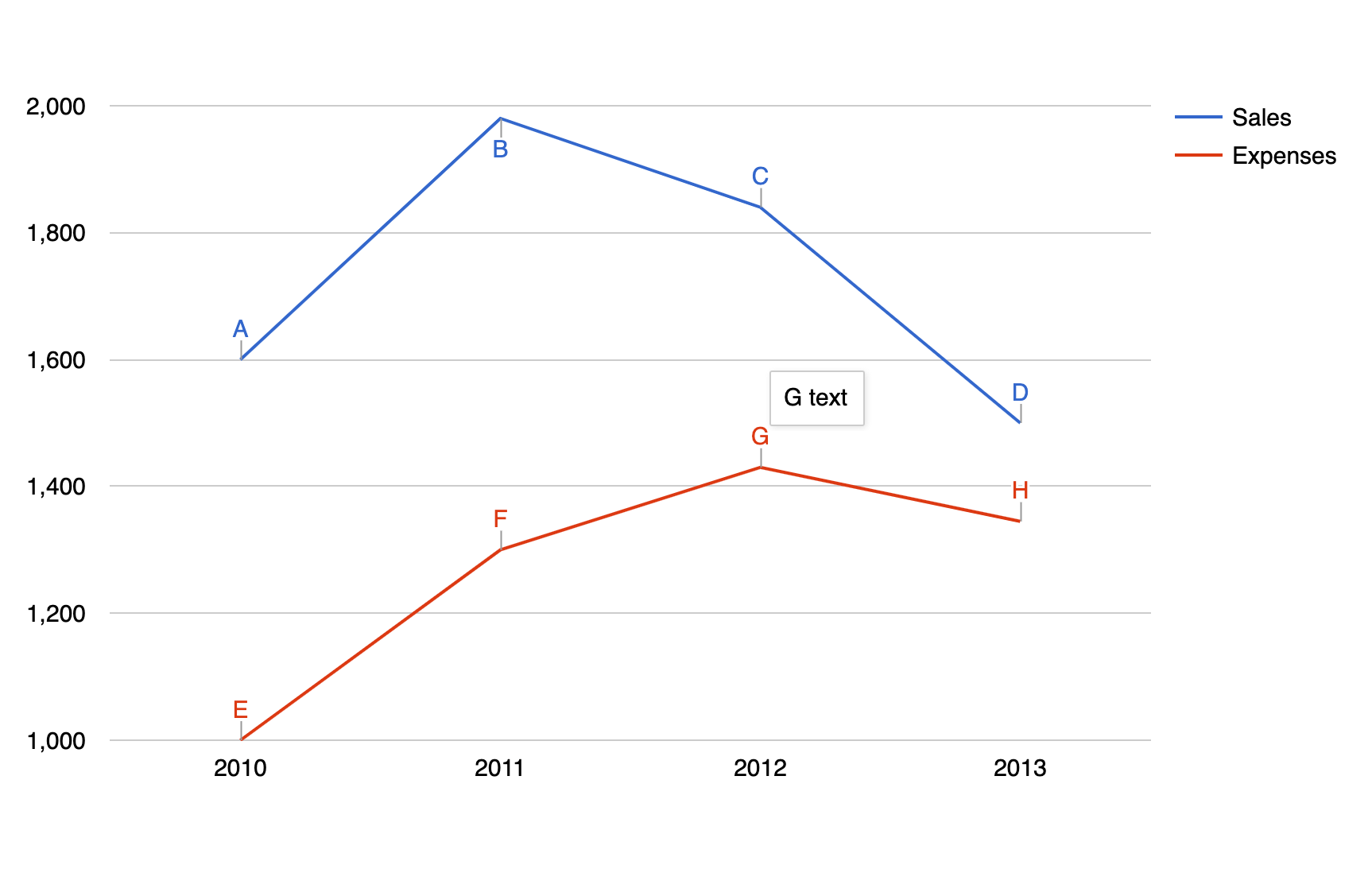 For this example, we have a line chart, with three columns Year ( of type string ), Sales ( of type number ), and Expenses ( of type number ). After each of the Sales and Expenses columns, we have a dedicated column we've named Annotation ( of type string ) which is used as the annotation column of the chart. For that to happen, you must go to the Advanced tab > Series Settings > Select each of the Annotation columns and for them choose the Annotation Special Role.