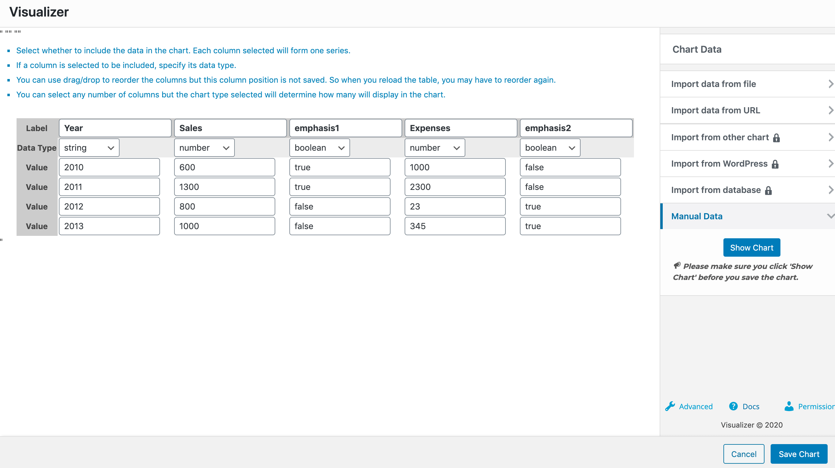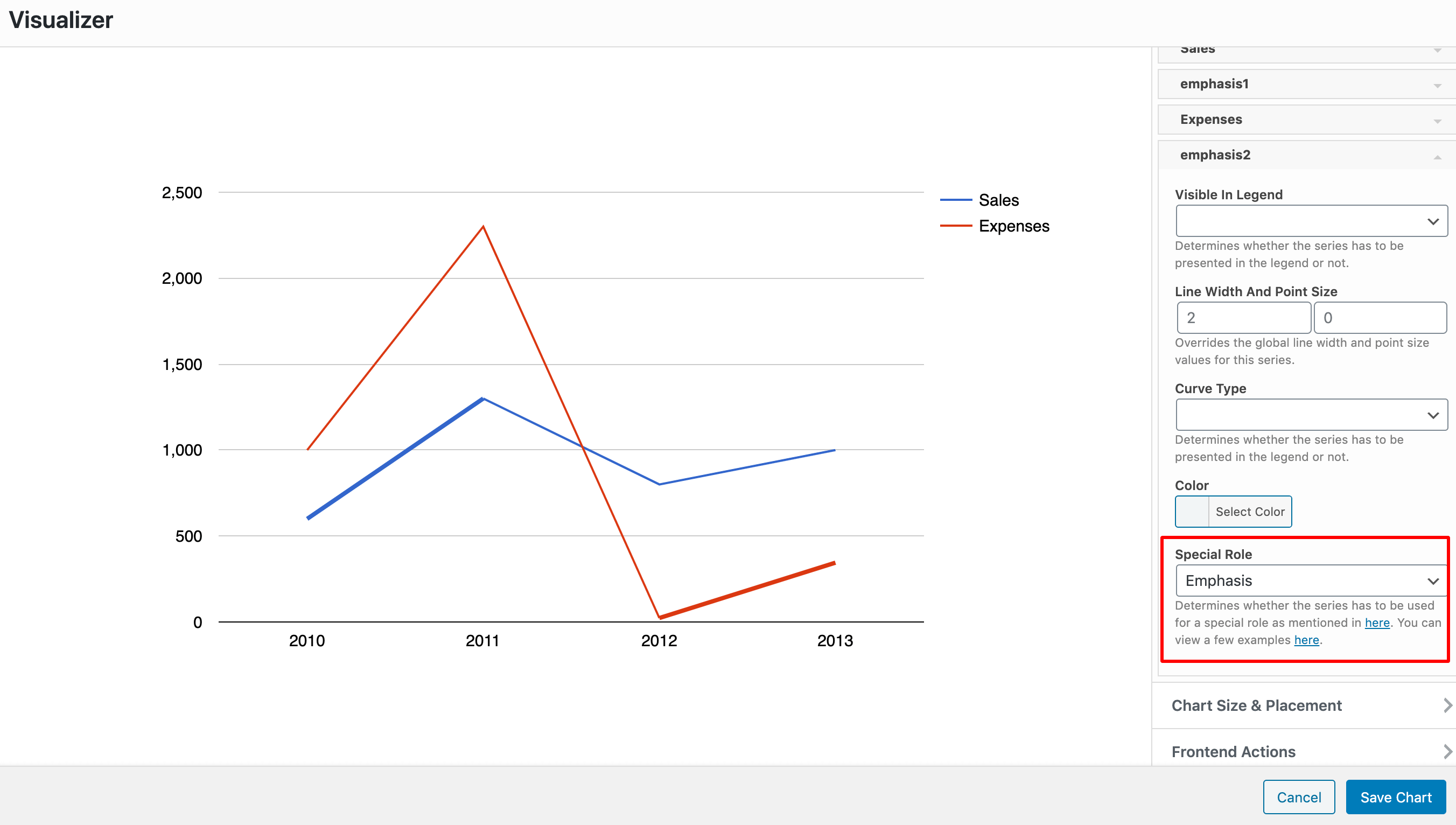 For this example, we have a line chart, with the three columns Year ( of type string ), Sales ( of type number ), and Expenses ( of type number ). For each of the Sales and Expenses columns, we have a dedicated column emphasis ( of type boolean ) which is used as the emphasis column of the chart. For that to happen, you must go to the Advanced tab > Series Settings > Select each of the emphasis columns and for them choose the Emphasis Special Role.