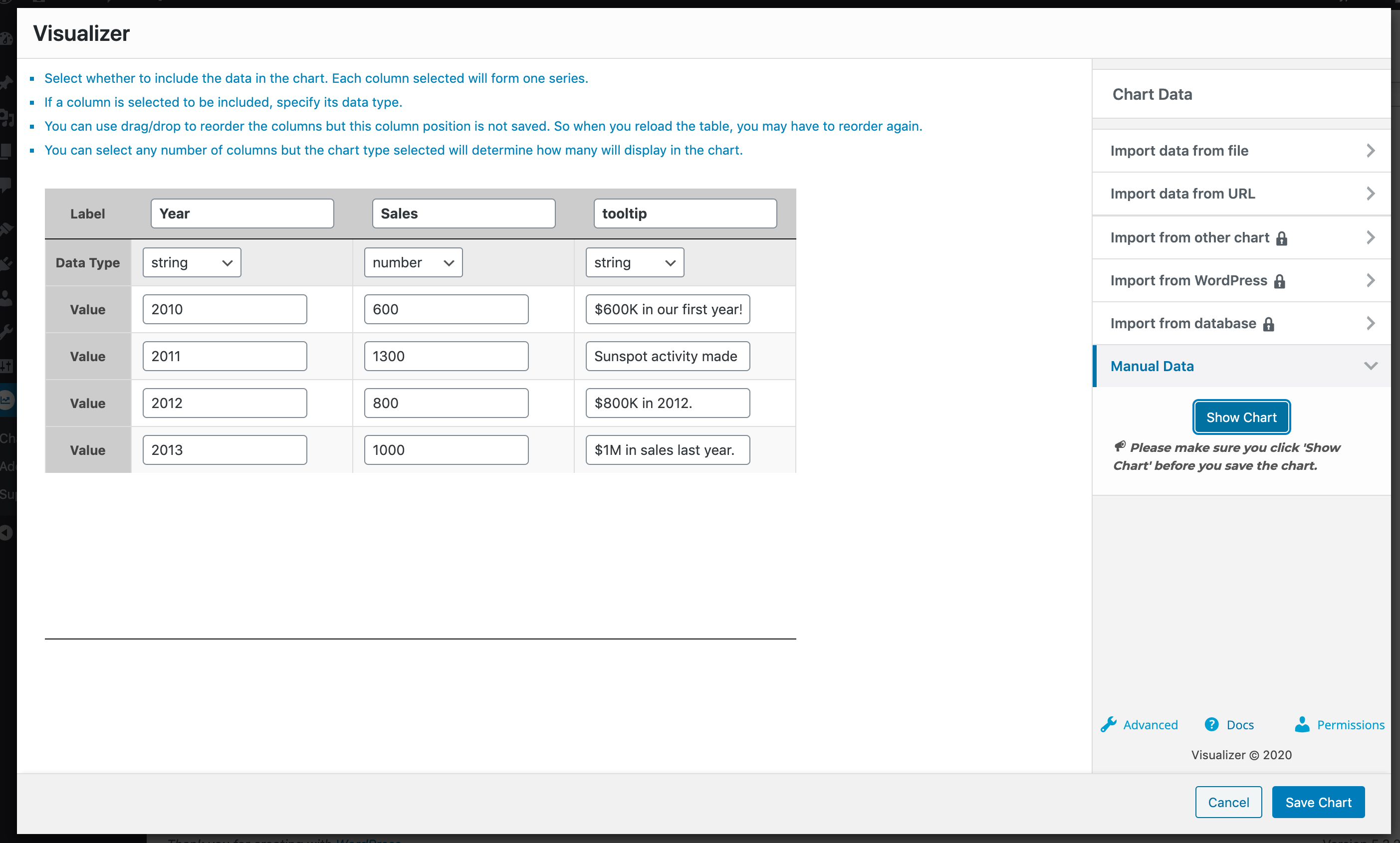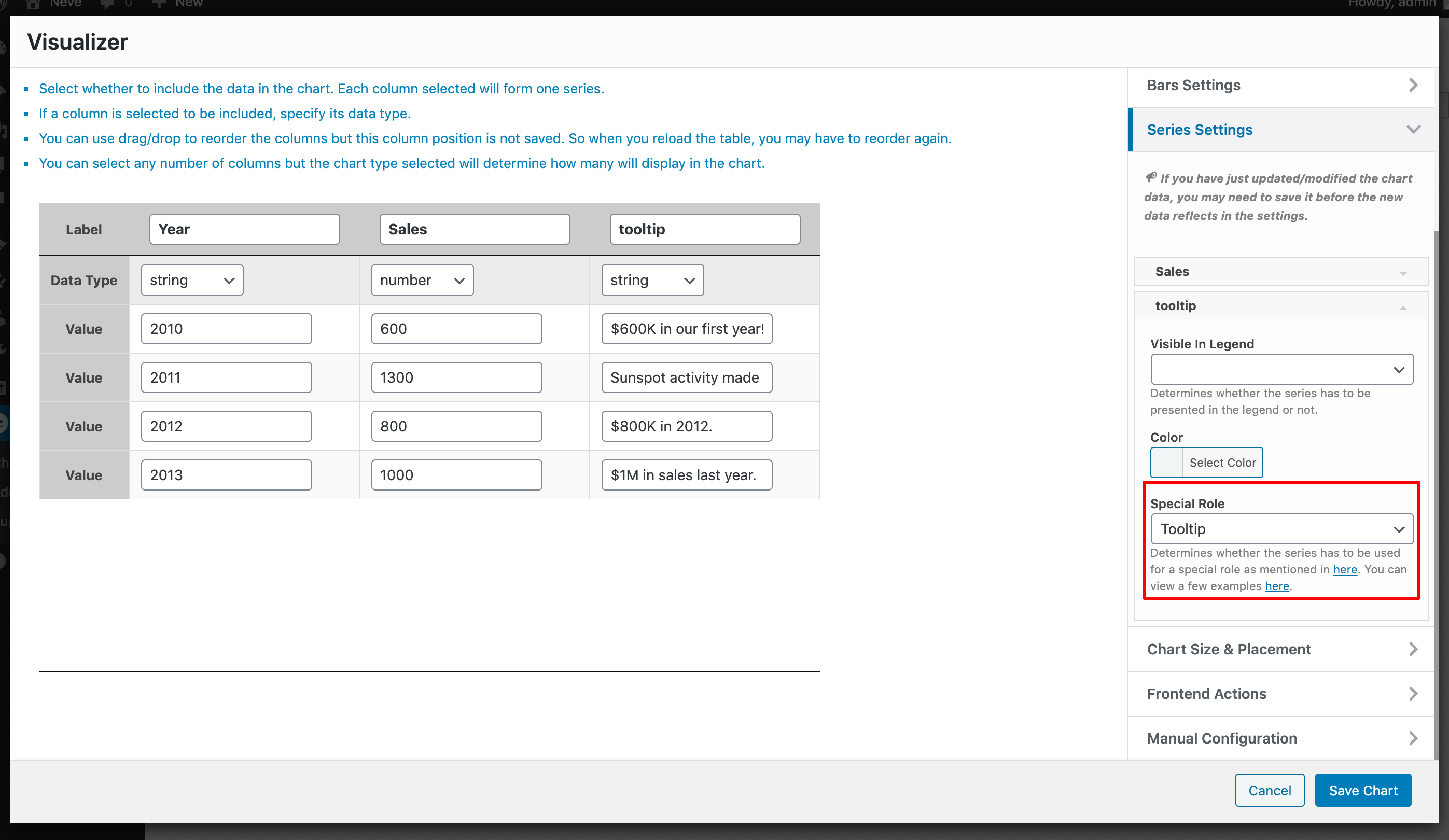 For this example, we have a column chart, with two columns Year ( of type string ) and Sales ( of type number ), and a third column Tooltip ( of type string ) which is used as the tooltip of the chart. For that to happen, you must go to the Advanced tab > Series Settings > Select the Tooltip column and for that choose the Tooltip Special Role.