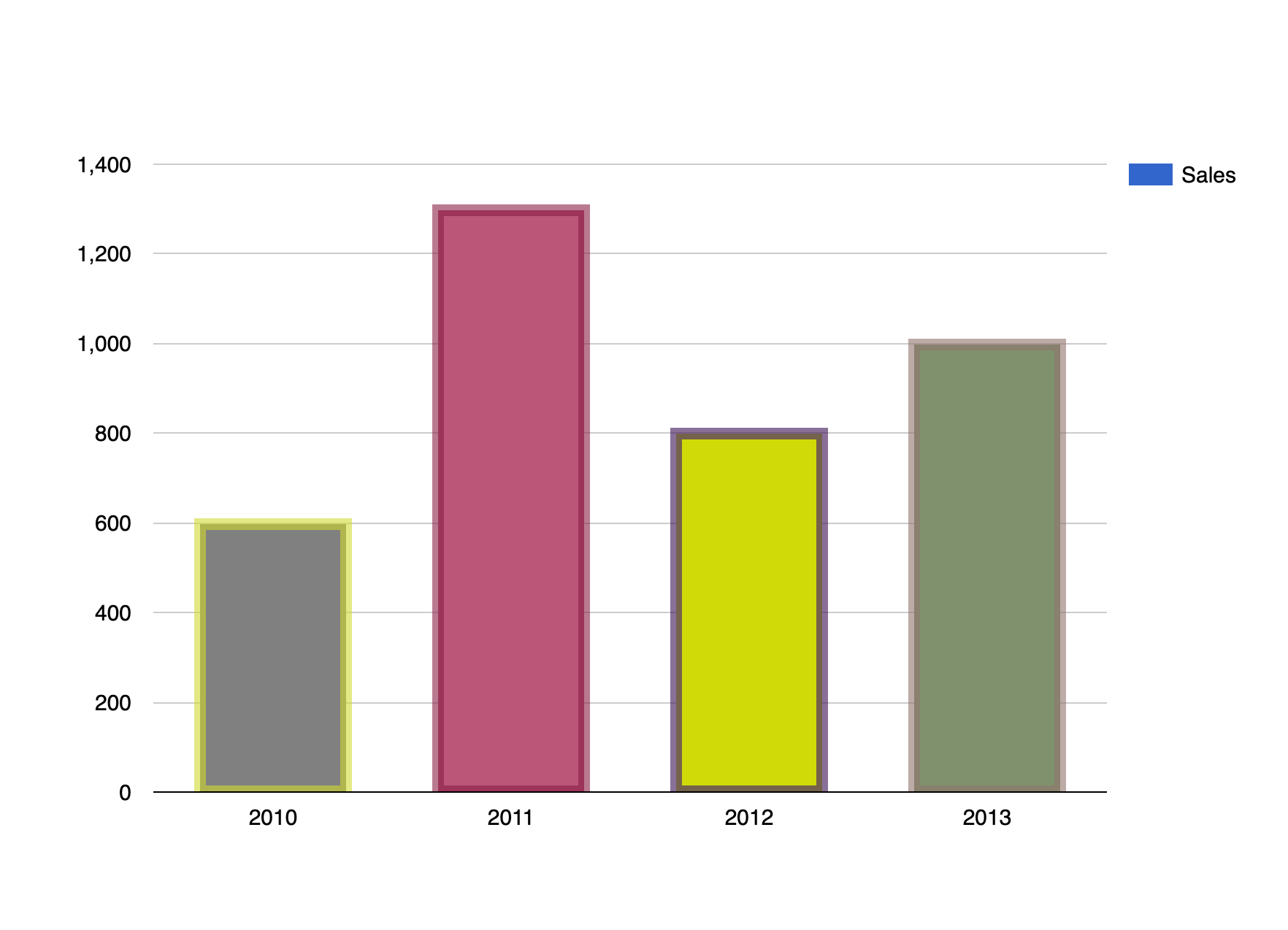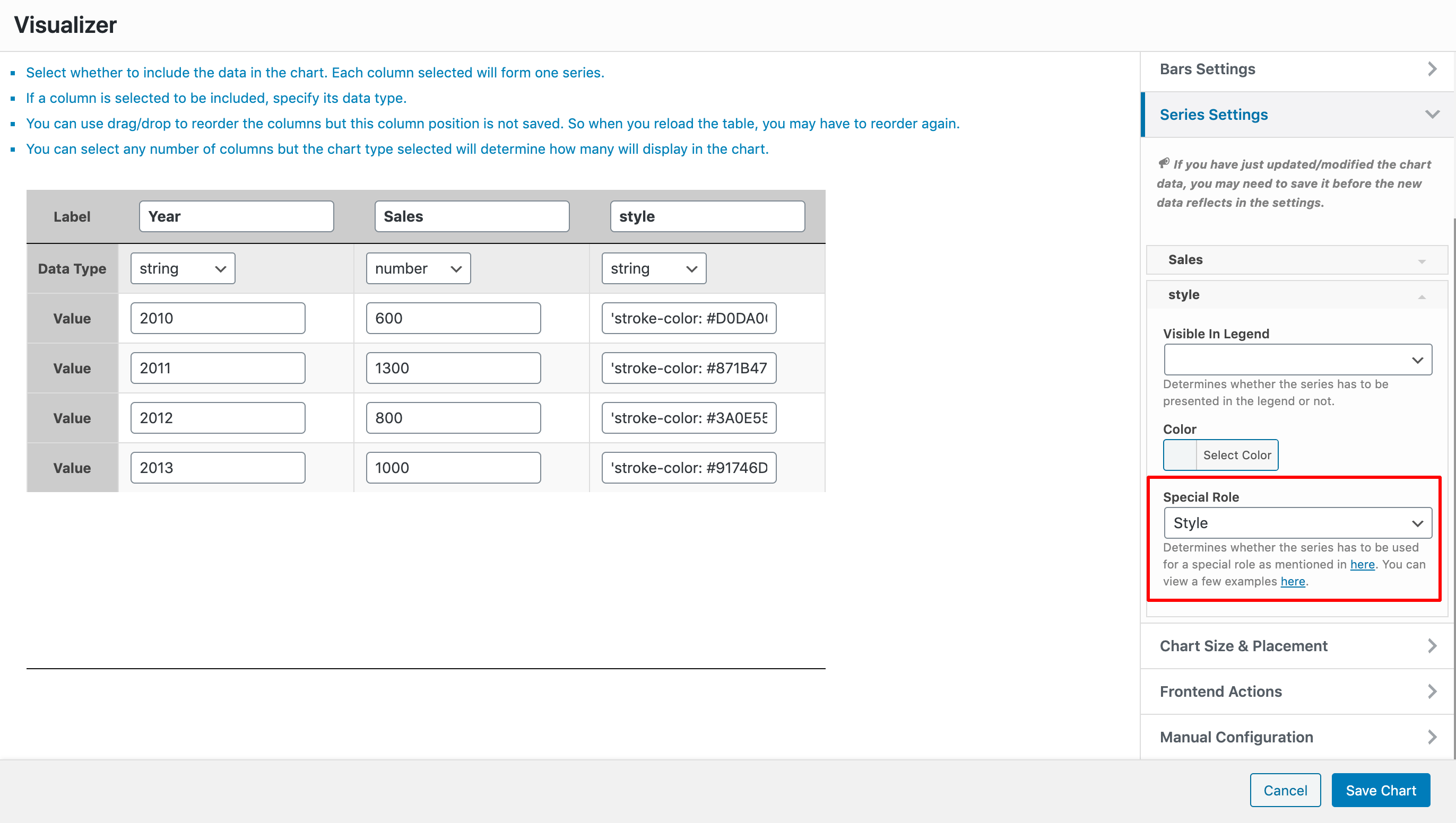 For this example, we have a column chart, with two columns Year ( of type string ) and Sales ( of type number ), and a third column Style ( of type string ) which is used as the style column of the chart. For that to happen, you must go to the Advanced tab > Series Settings > Select the Style column and for that choose the Style Special Role.