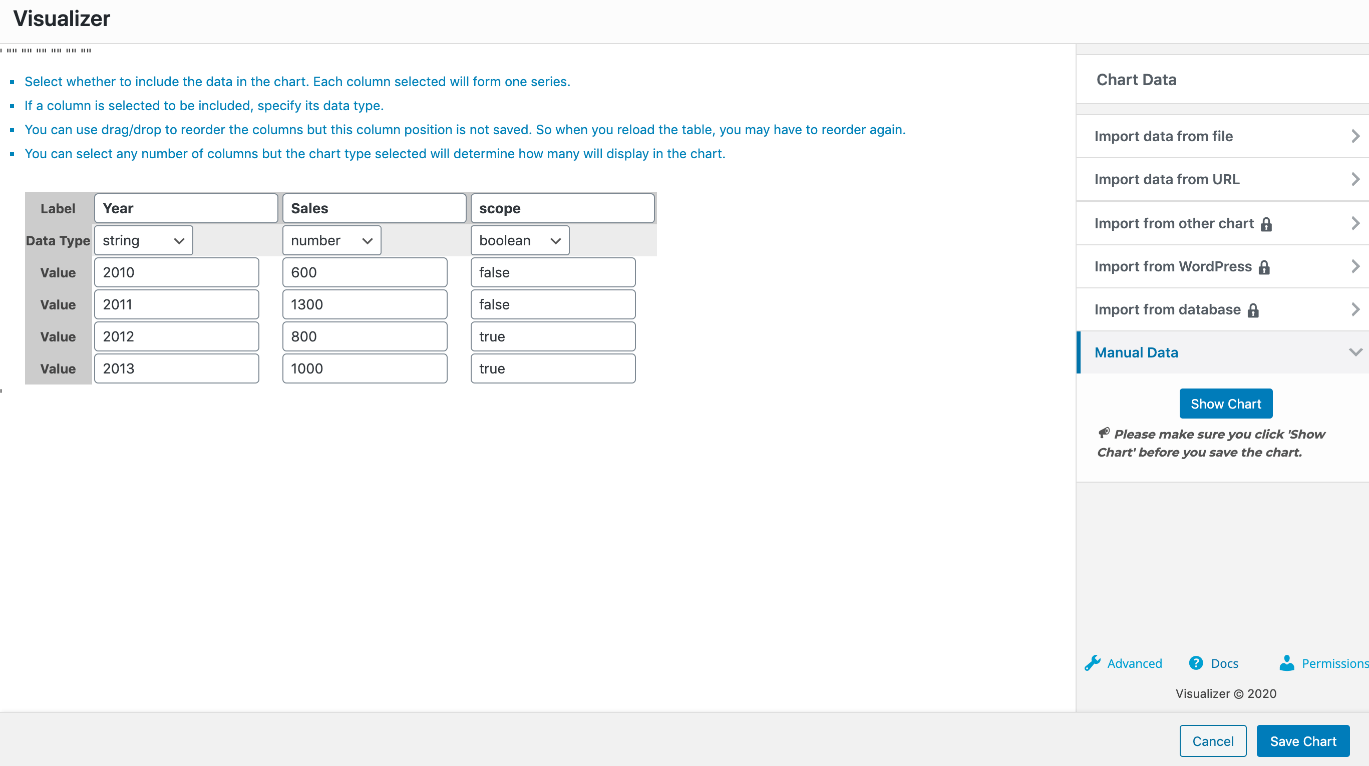 For this example, we have a line chart, with two columns Year ( of type string ) and Sales ( of type number ), and a third column Scope ( of type boolean ) which is used as the scope column of the chart. For that to happen, you must go to the Advanced tab > Series Settings > Select the Scope column and for that choose the Scope Special Role.