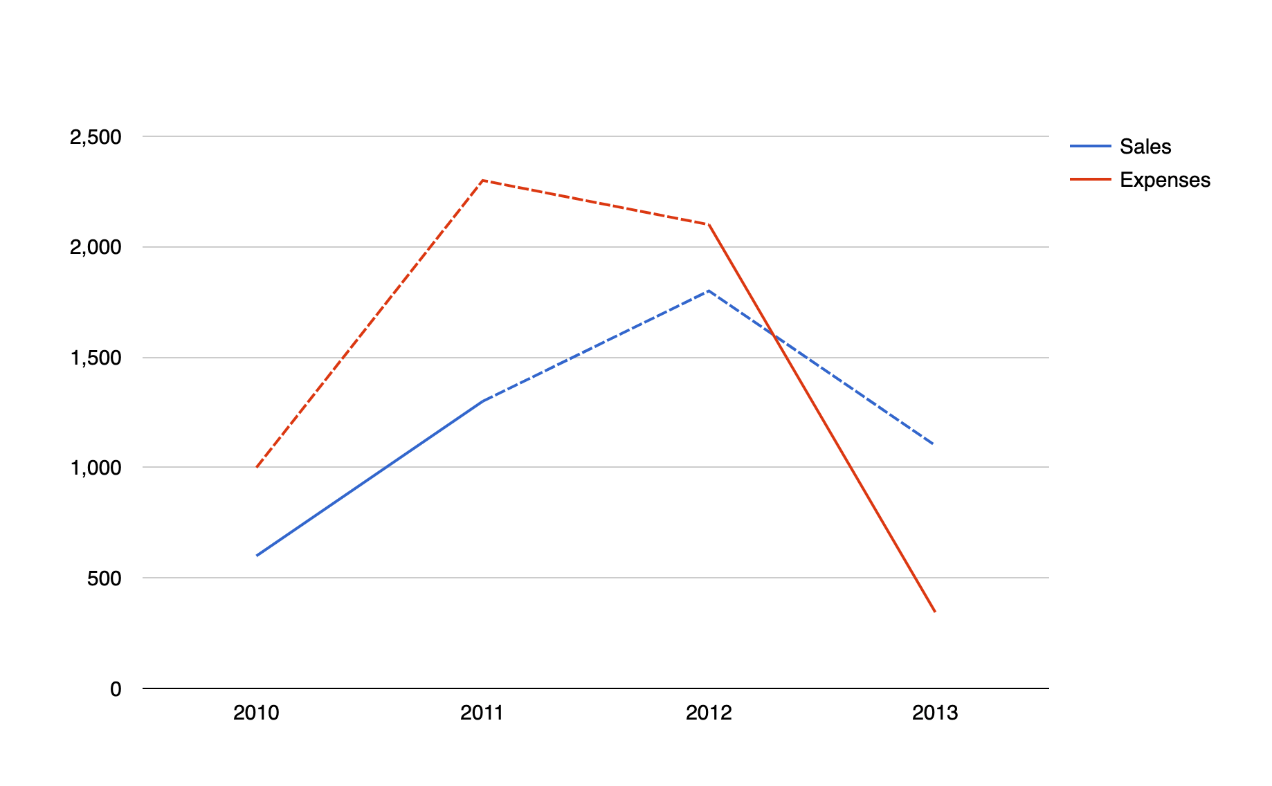 For this example, we have a line chart, with three columns Year ( of type string ), Sales ( of type number ), and Expenses ( of type number ). For each of the Sales and Expenses columns, we have a dedicated column certainty ( of type boolean ) which is used as the certainty column of the chart. For that to happen, you must go to the Advanced tab > Series Settings > Select each of the certainty columns and for them choose the Certainty Special Role.
