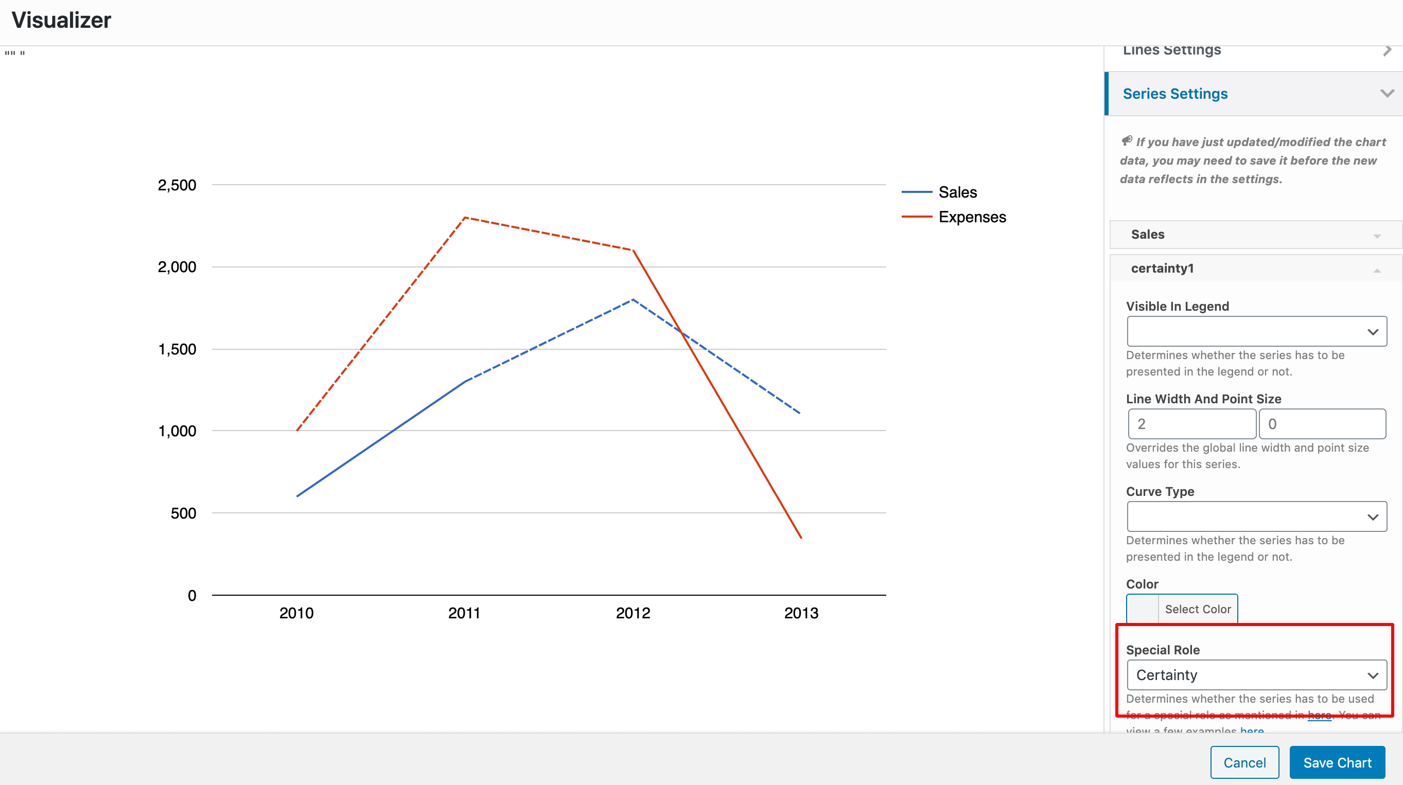 In the latest versions of Visualizer, we added support for different roles that can be assigned to your chart series.