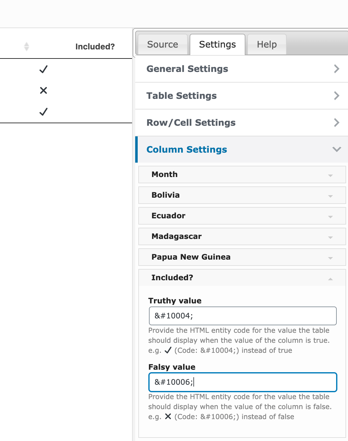 • for boolean - you can add an HTML code to display instead of the default true and false values. Similar to the image below you can have a ✔️ symbol for true, and an ❌ symbol for false.