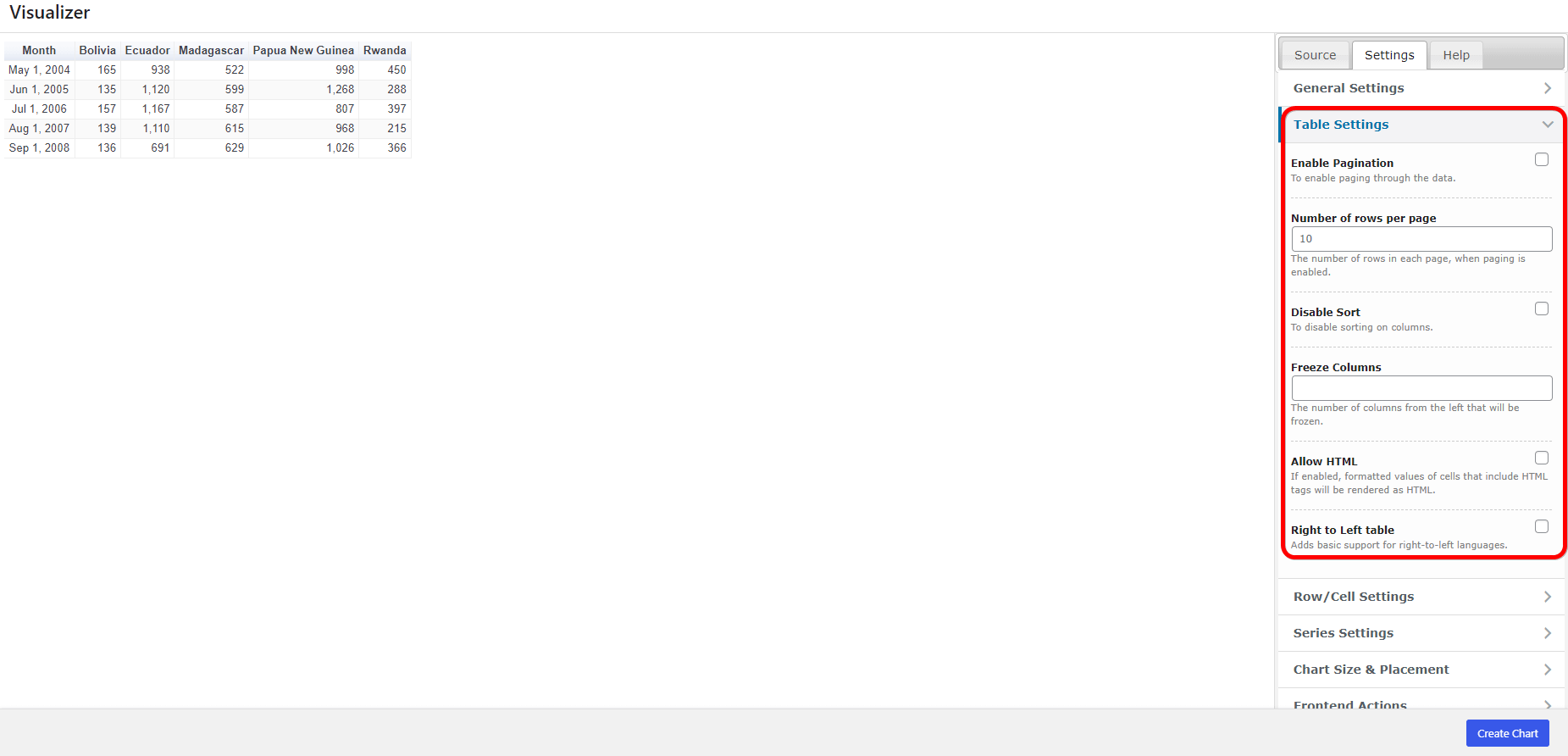 • Disable Sort - by default, charts have a sorting mechanism for each column ( the little arrows near each column heading ). This option allows for disabling the sorting feature.