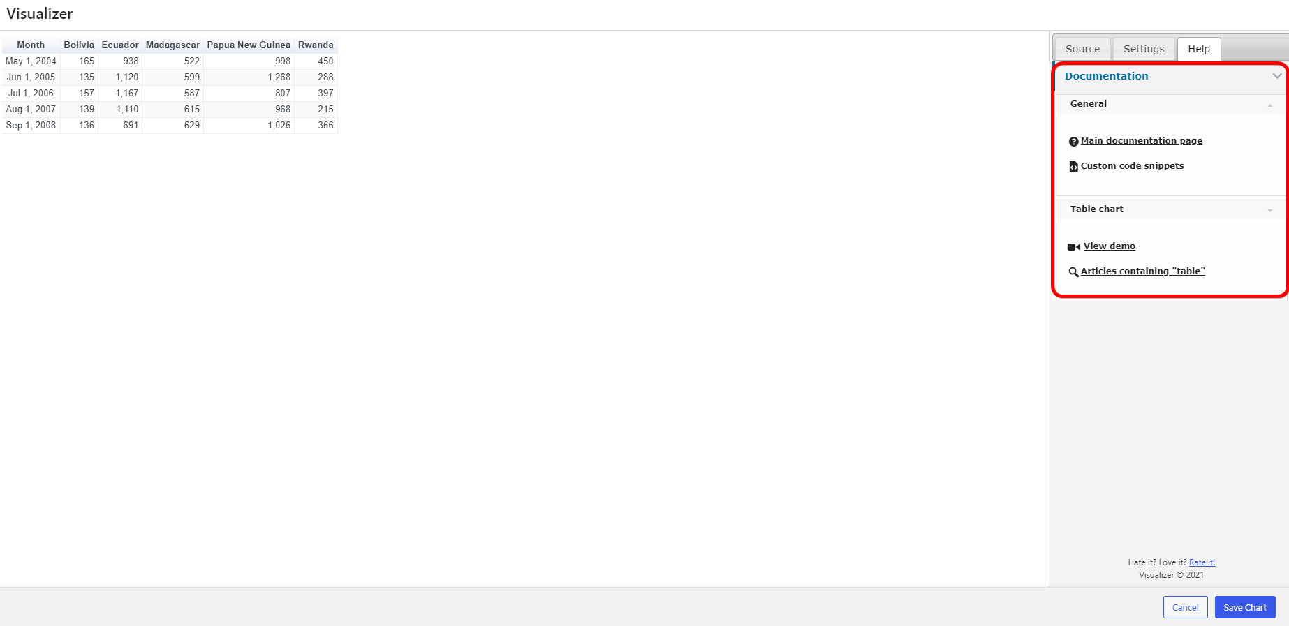 In this area, you have access to more docs created to help with using Visualizer Table Charts, to custom code snippets, and also to video tutorials.