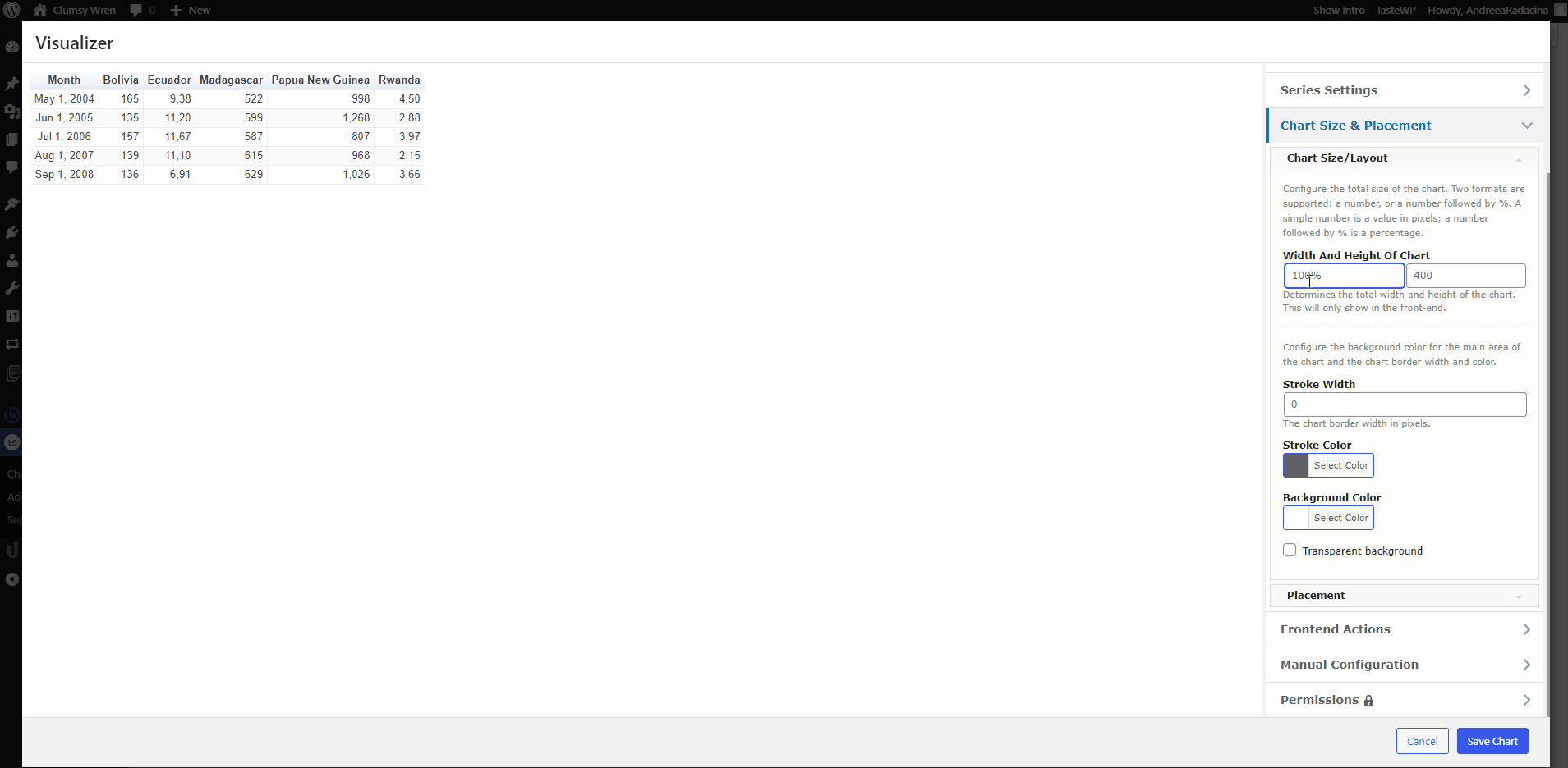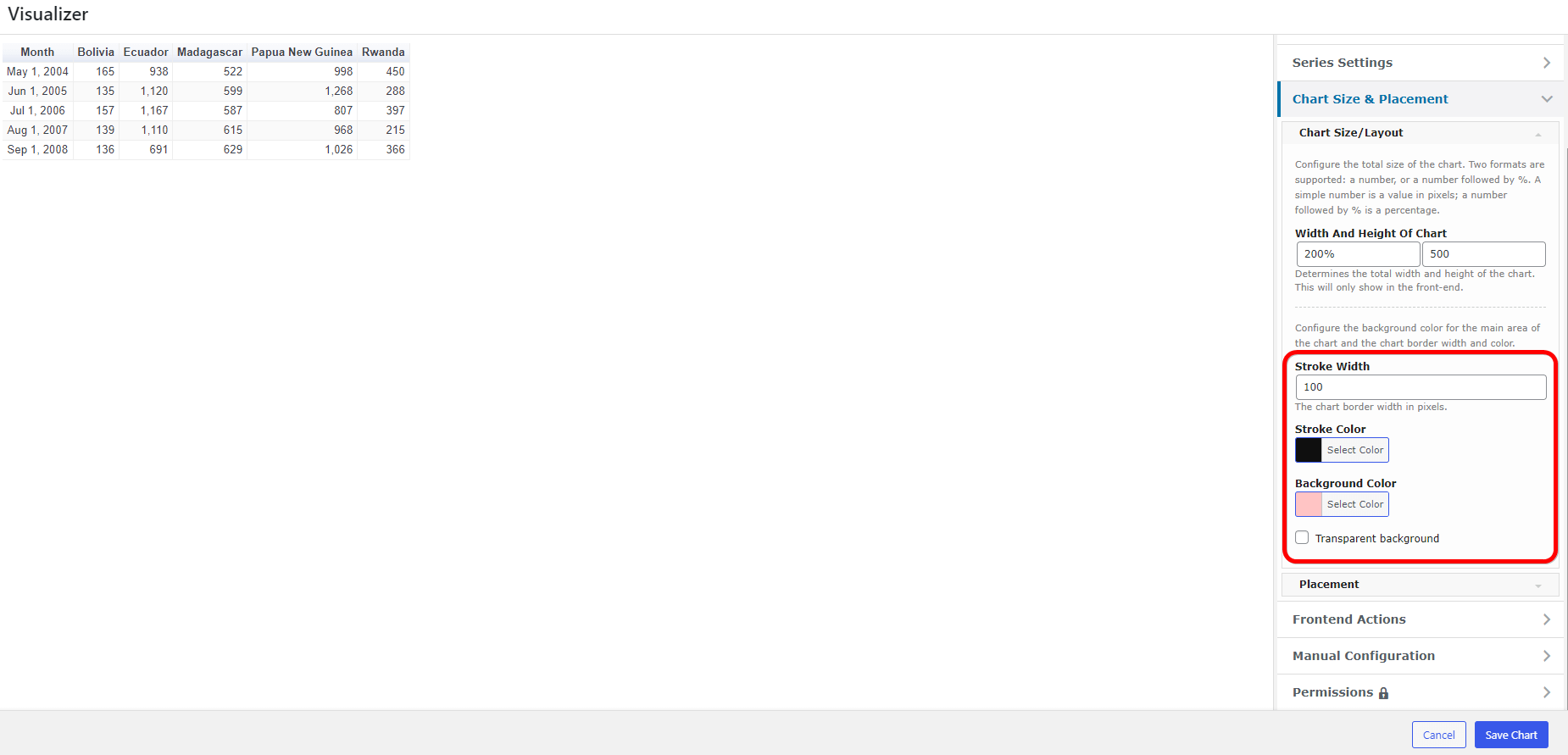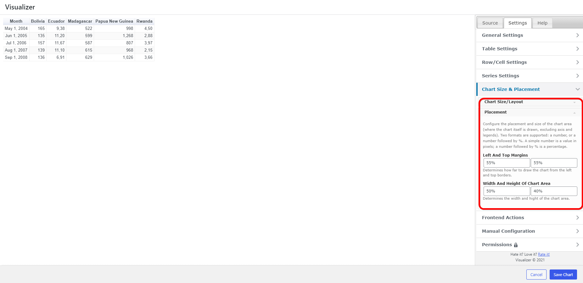• Width and Height of Chart - determines the whole dimension of the chart, which will appear on the front-end.