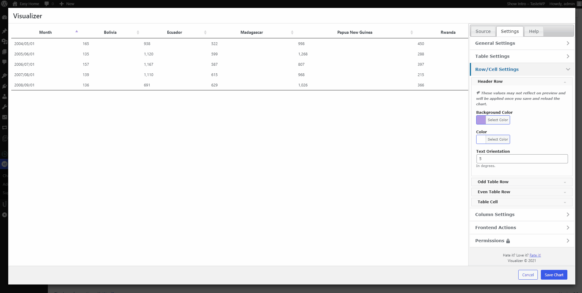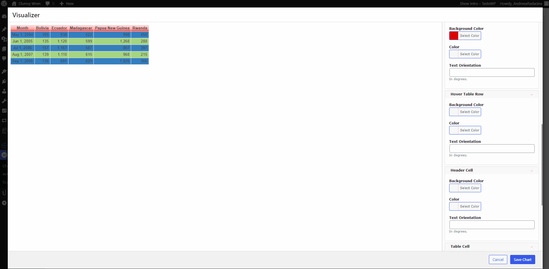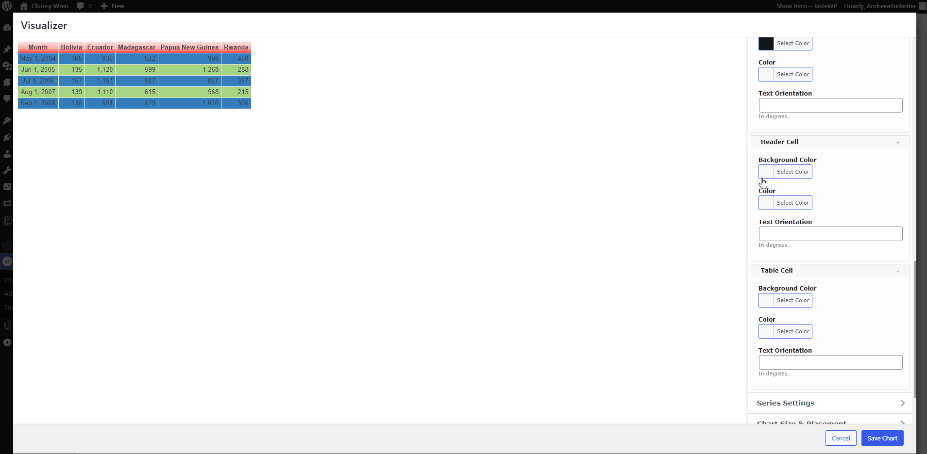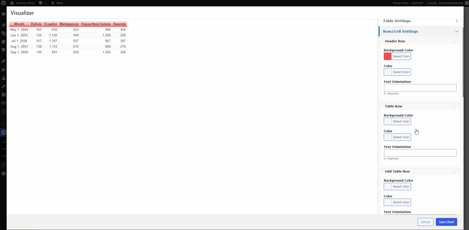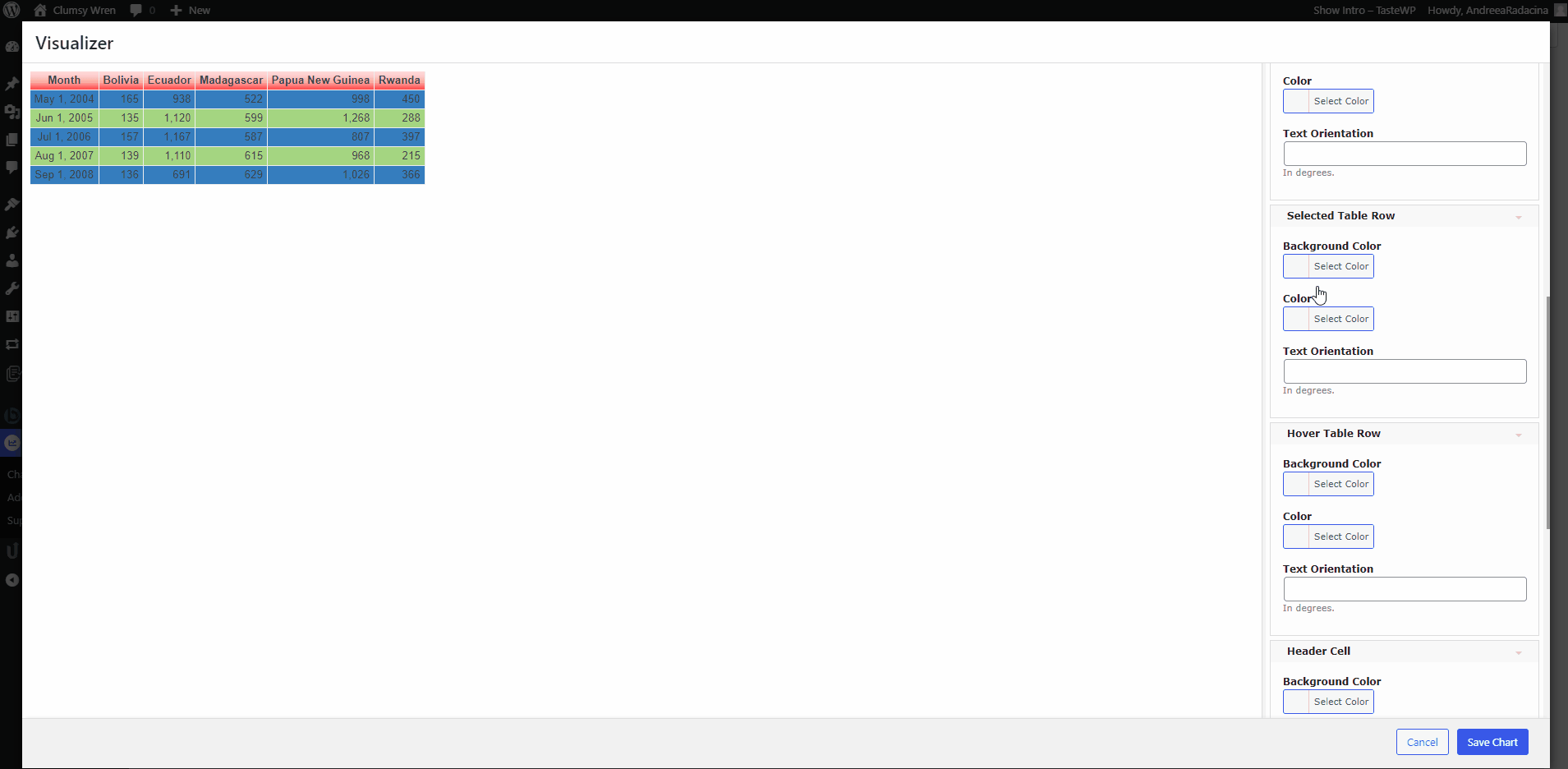 • Header Cell - will change the color of every individual header cell (you can notice the difference between header cell and header row if you modify the text orientation).