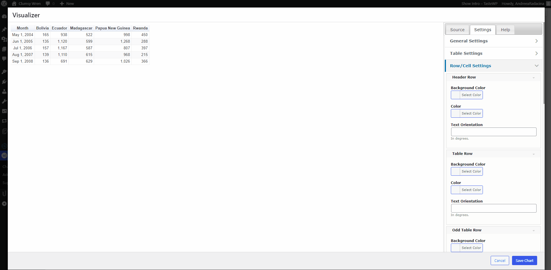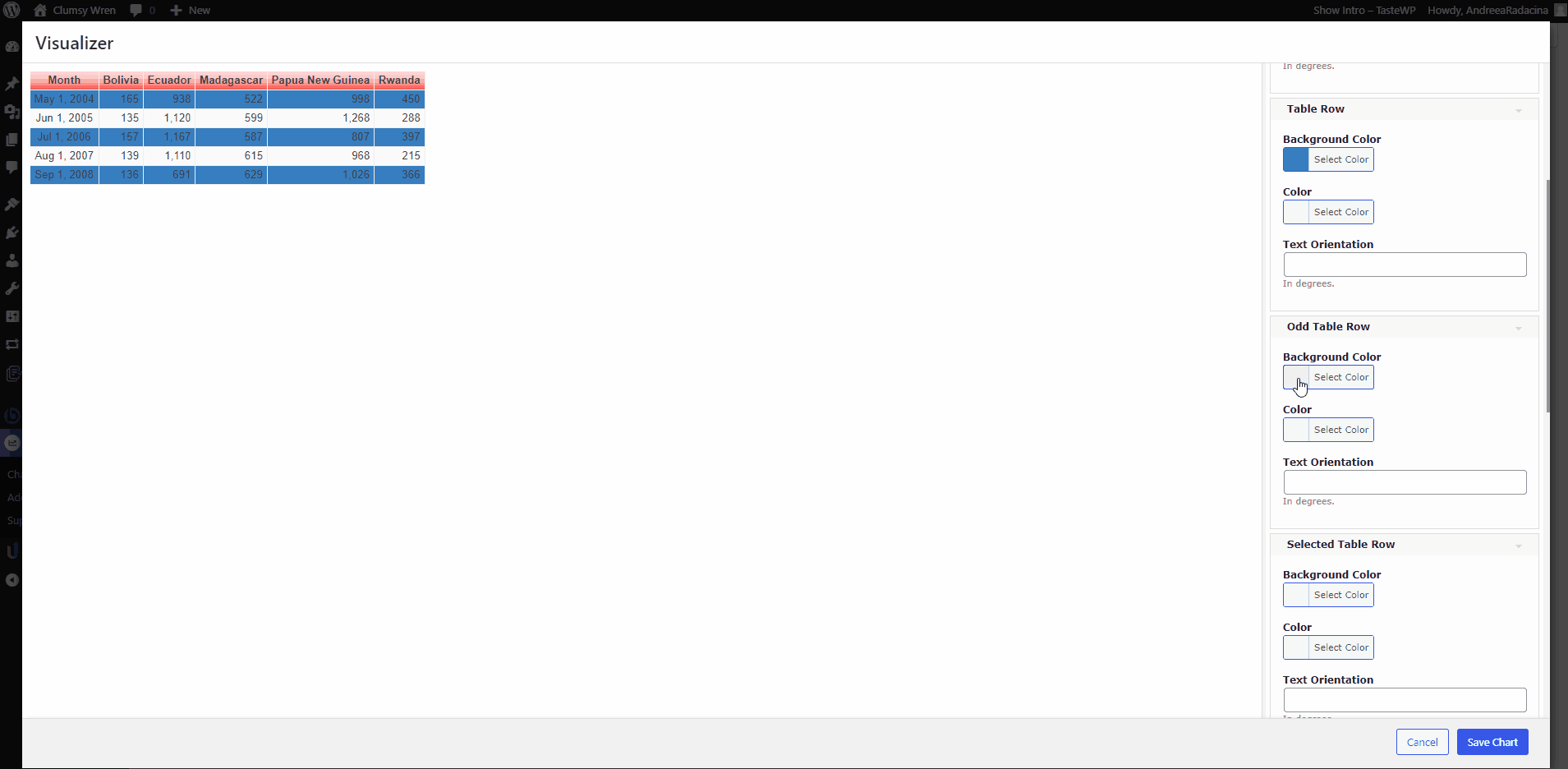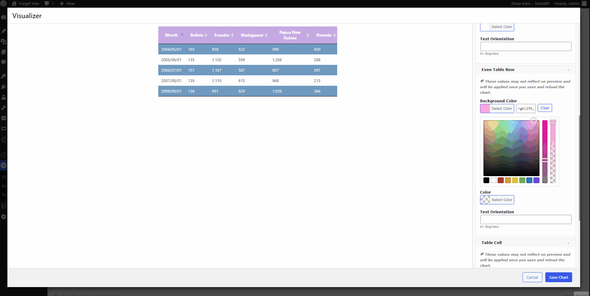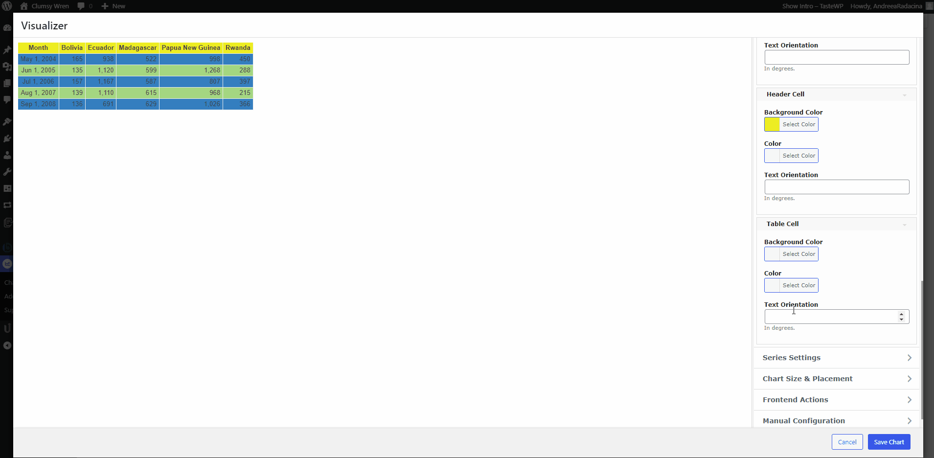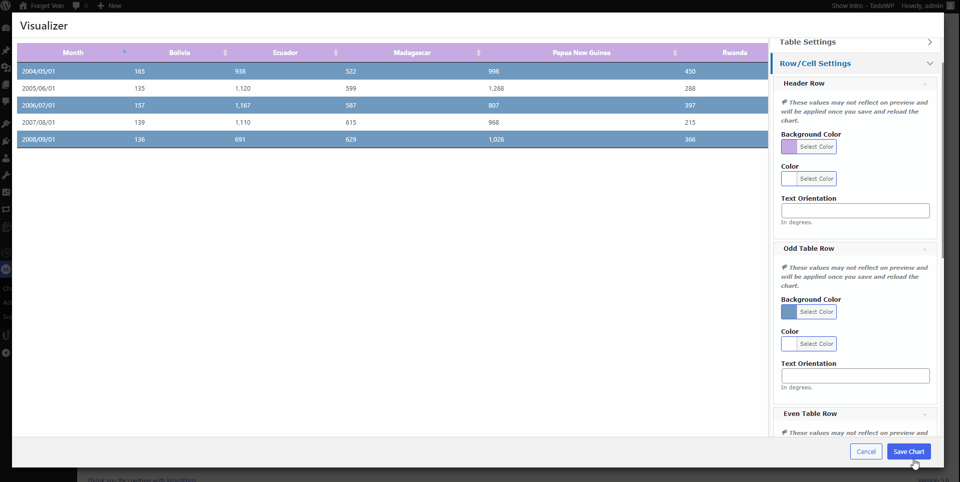 • Header Cell - will change the color of every individual header cell (you can notice the difference between header cell and header row if you modify the text orientation).