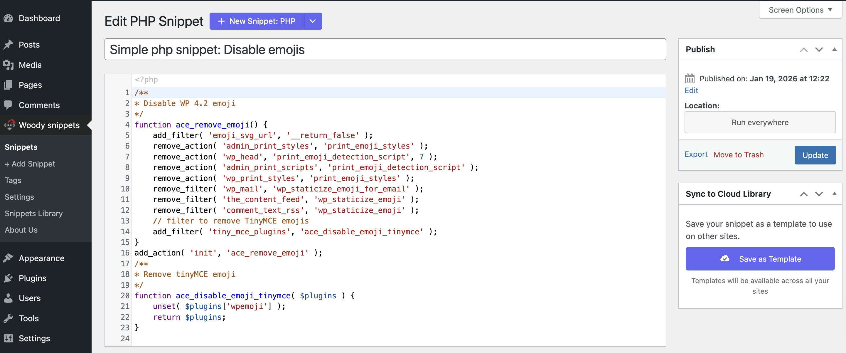 Woody snippets help you to execute PHP code, insert ad units, or other external widget code anywhere in your WordPress website. Brief documentation gives an overview of all plugin features.