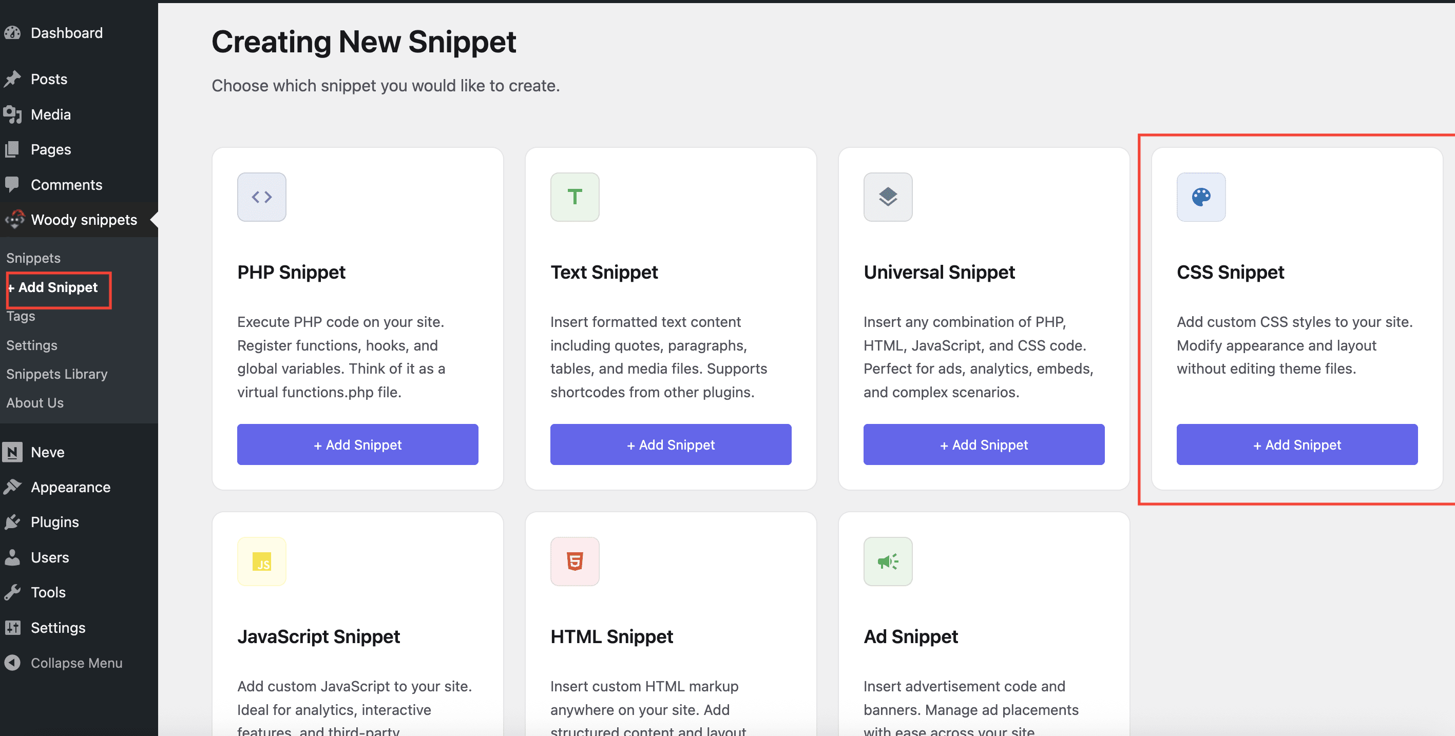 Woody snippets => +Add snippet => choose CSS snippet. Press +Add Snippet to create a snippet.