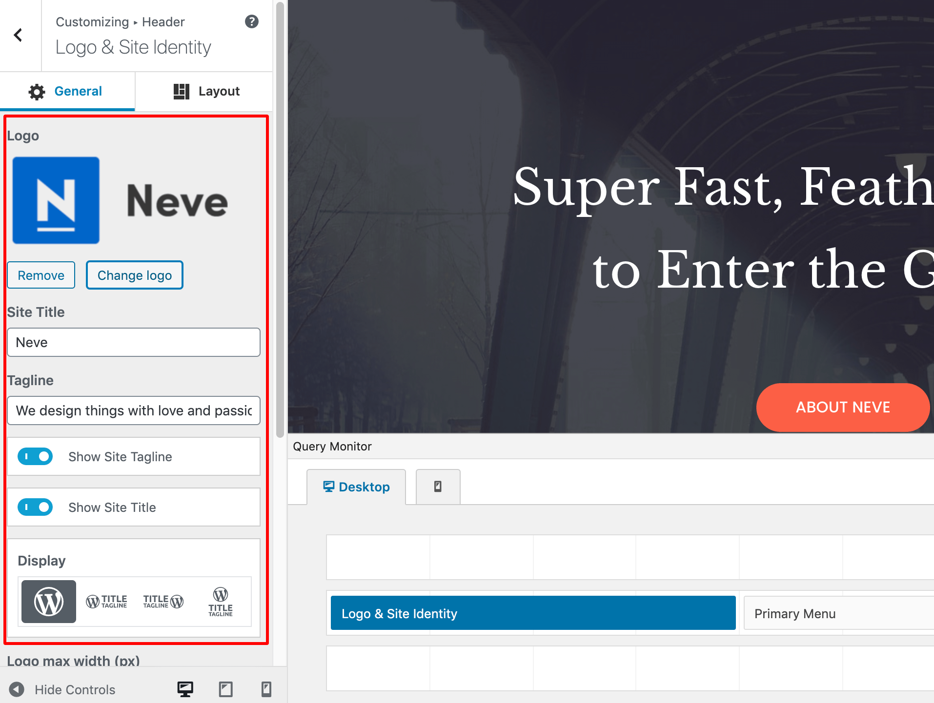 Neve offers multiple options for positioning the logo and Site Title and Tagline: