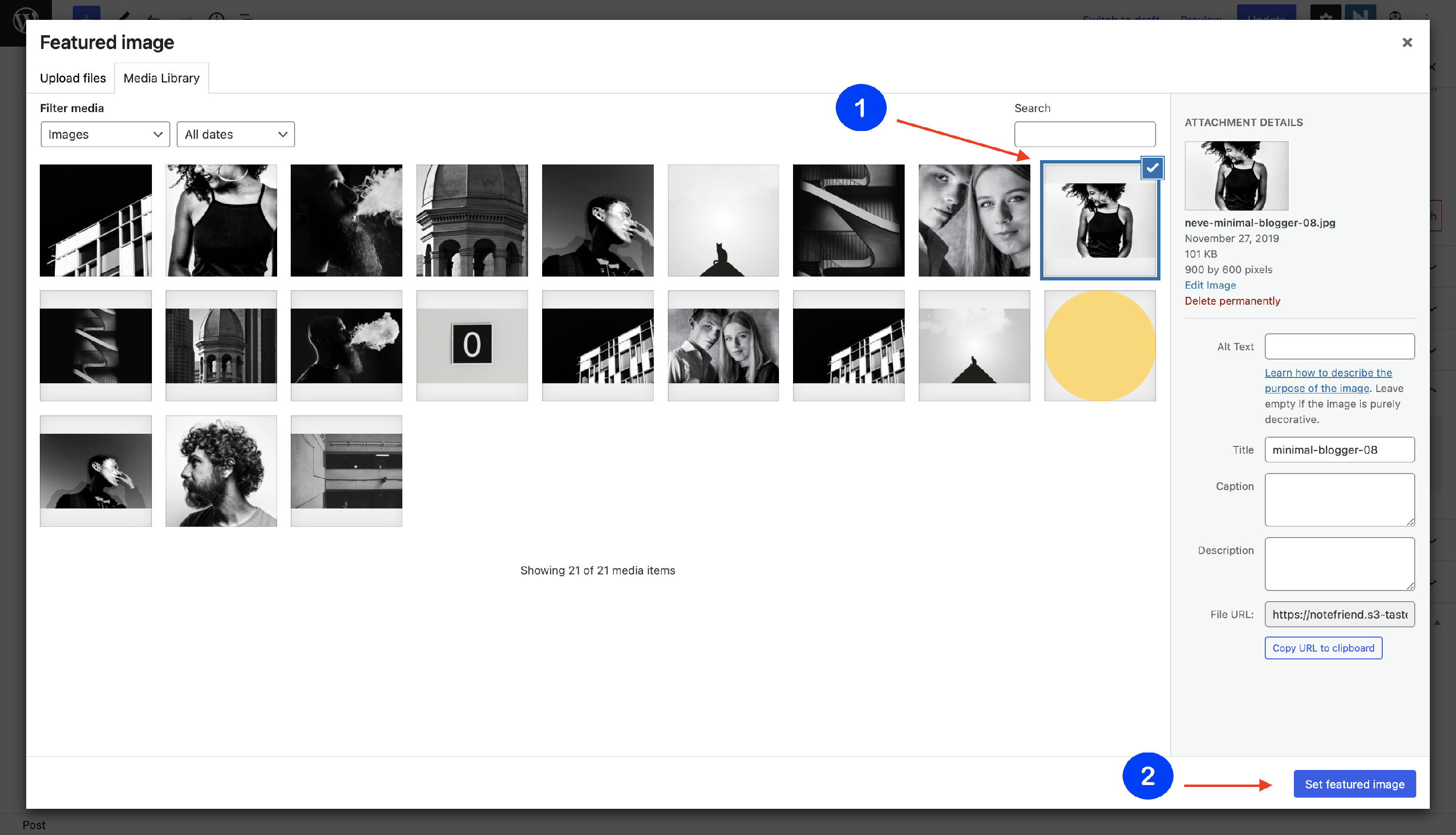 3 Click on Set featured image and upload one from your computer or select from the media library.