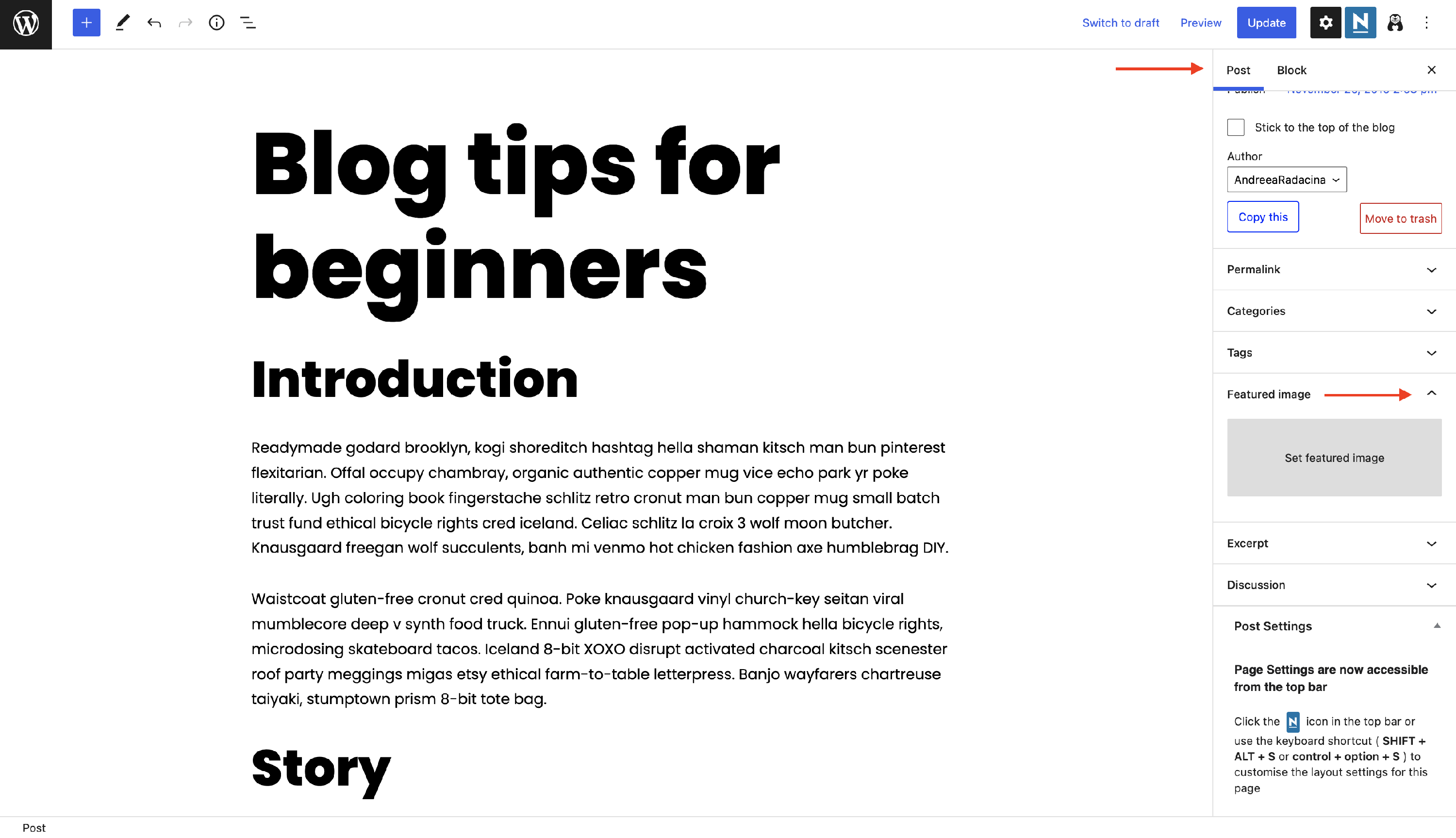2 In the opened editor, under the Post settings, you will find the Featured Image option.