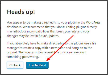 4 The page will automatically be redirected to the plugin edit screen. You might get a message like the one below; simply click I understand.