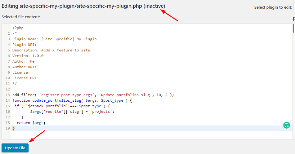 Paste the code snippet you received from our doc into the edit area and click Update File. Notice the activation status at the top next to the plugin file path. If it says inactive, you need to activate the plugin from your plugins area after updating the file.