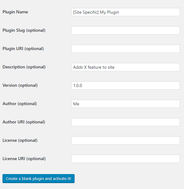 3 Fill out the plugin options, be sure to include the word Site Specific in the title so any other WordPress webmaster debugging your website will know that the plugin is a custom one.