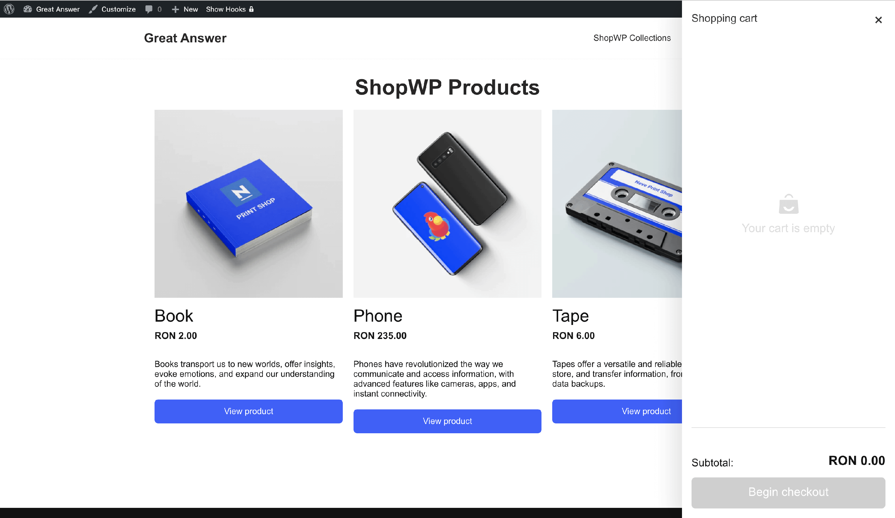 Now, navigate to Pages and open the ShopWP Product page. The products will be listed there, and the cart will be shown as a slide.
