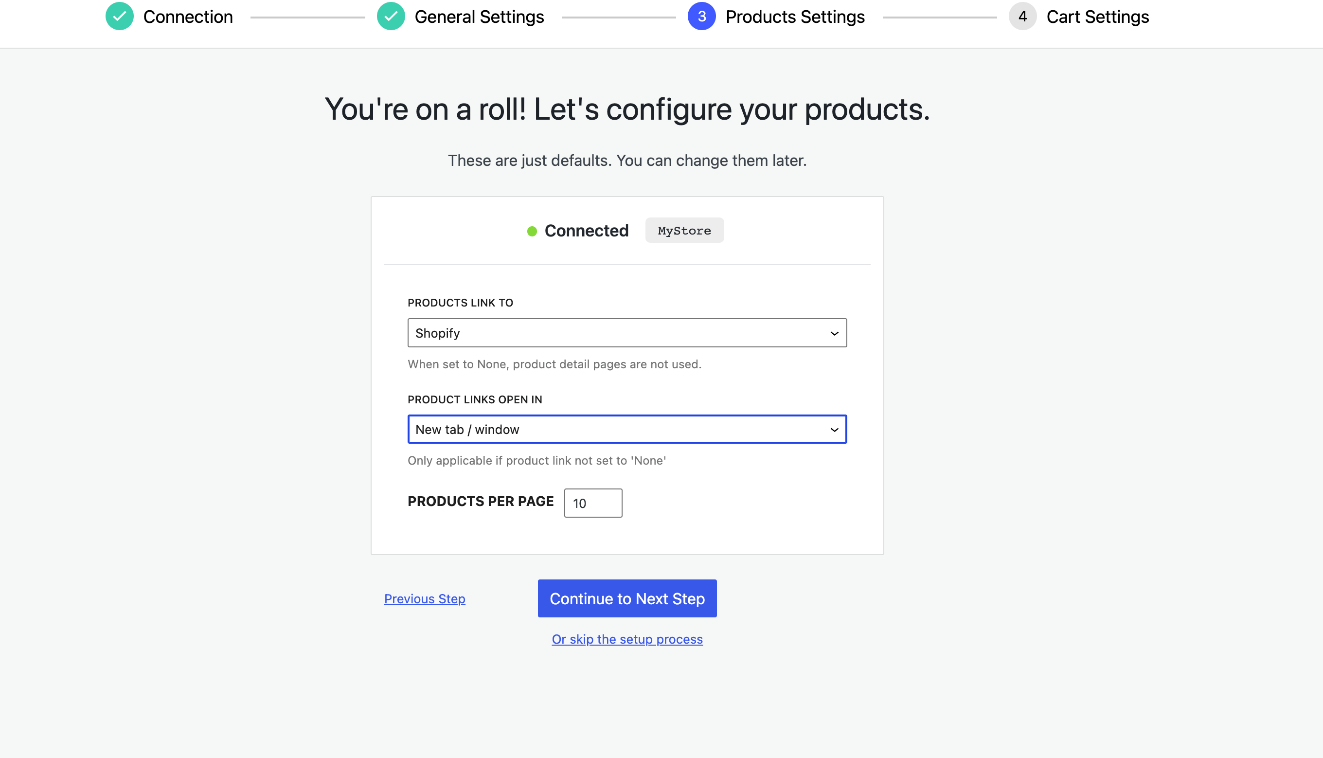 9 Customize product behavior: link to Shopify/WordPress/modal, number of products per page, and link behavior.