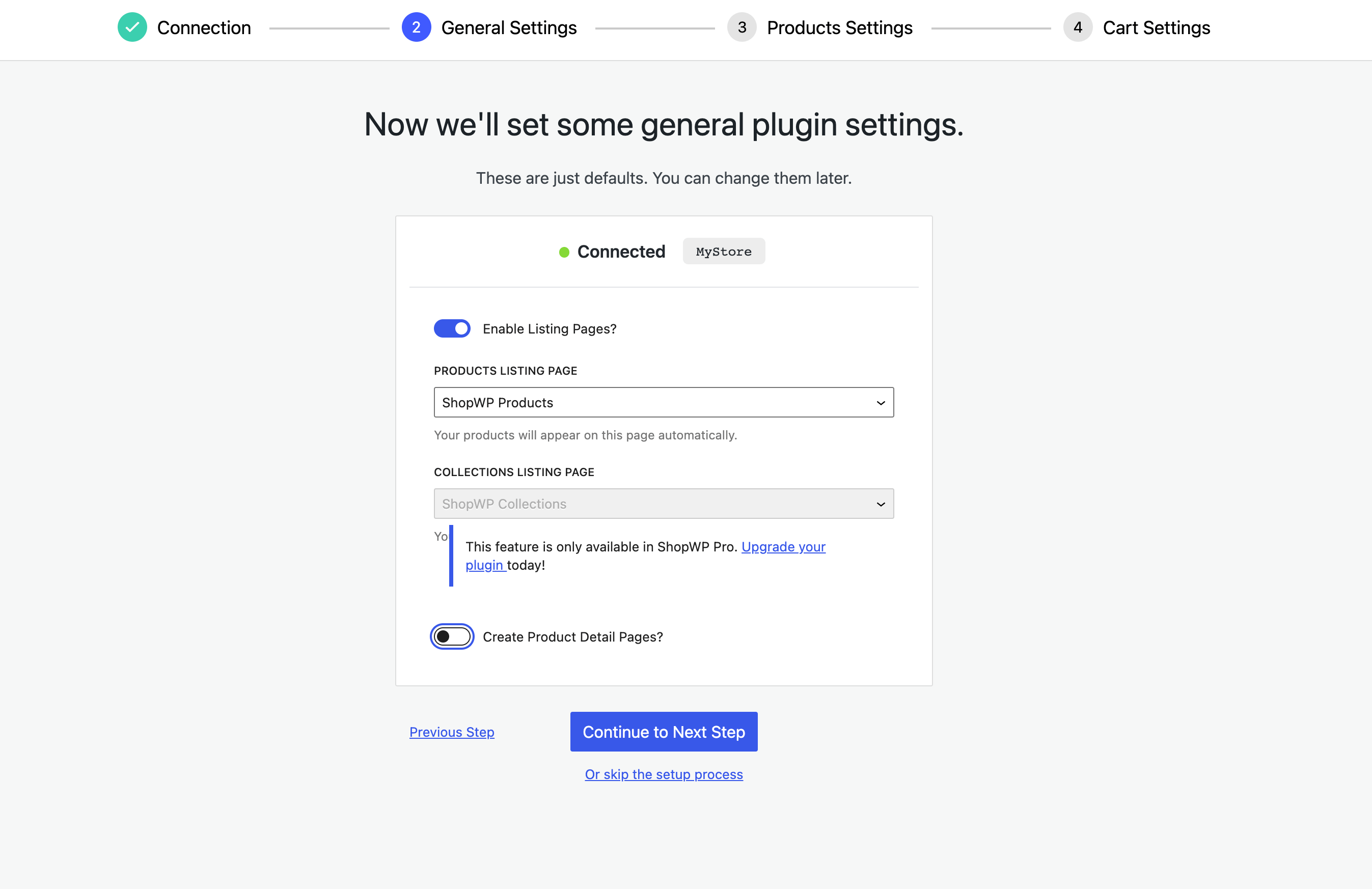 8 Configure store settings: enable Shopify listing pages or use WordPress default.