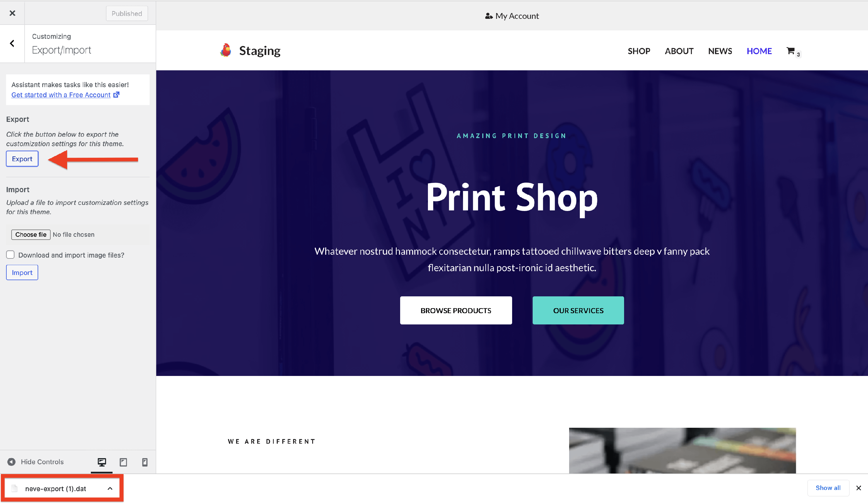 To export the customizer options, inside the Export/Import panel, click on the Export button.