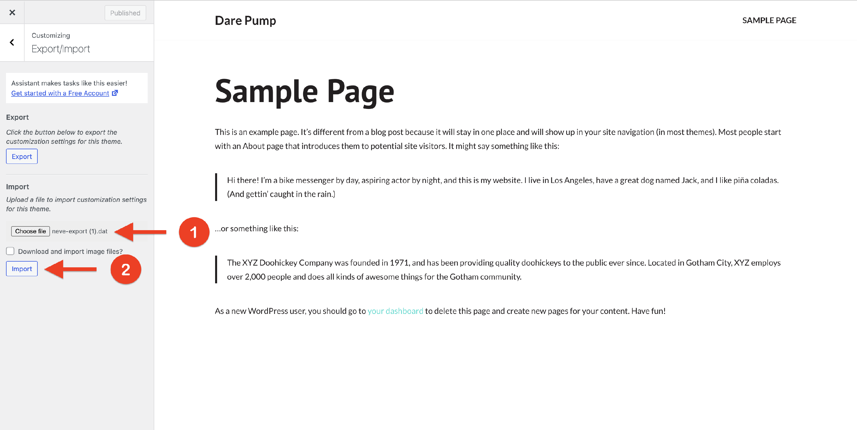 1 Navigate to Appearance > Customize, then open the Export/Import panel.
