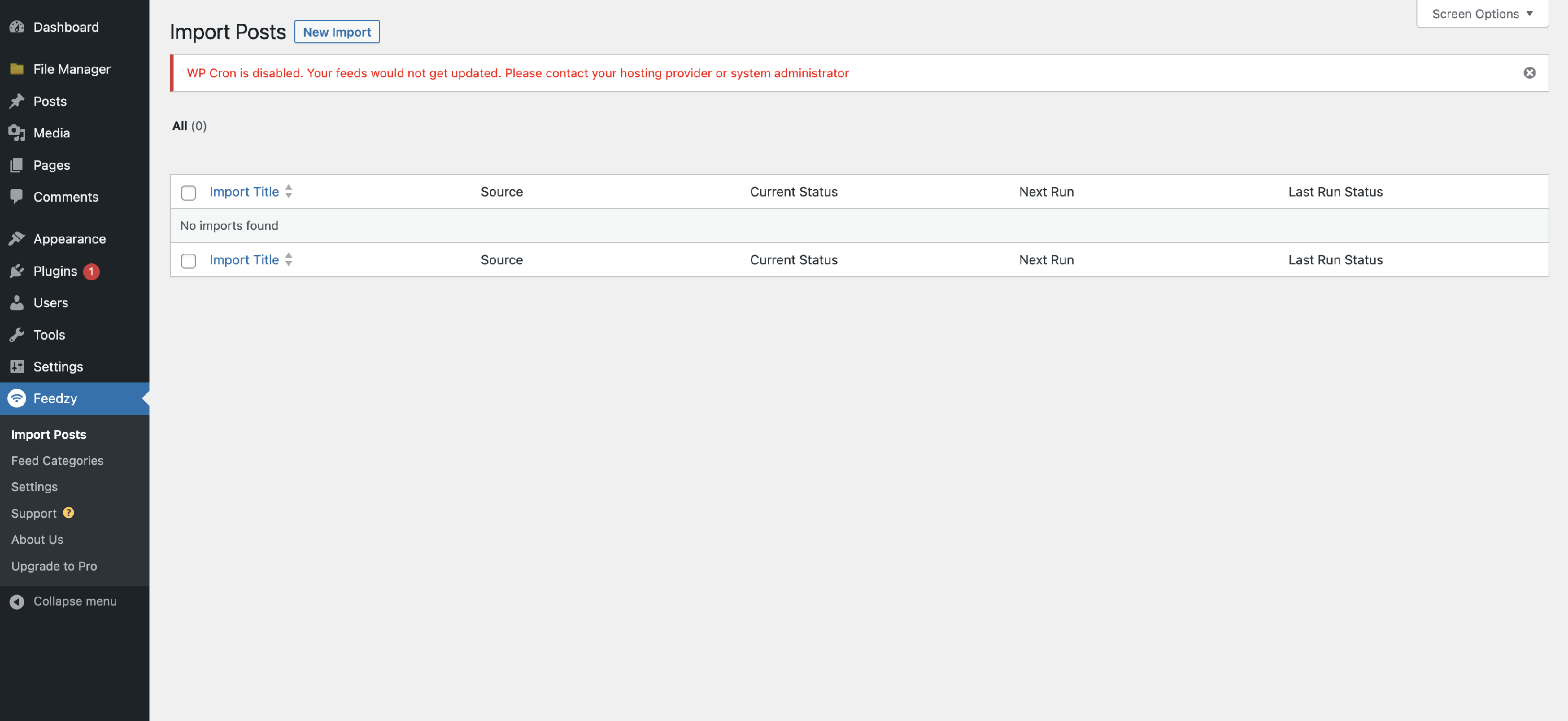Once you have turned off the default WP Cron, the plugin that uses it (in our example, Feedzy RSS Feeds) will generate a warning notice: