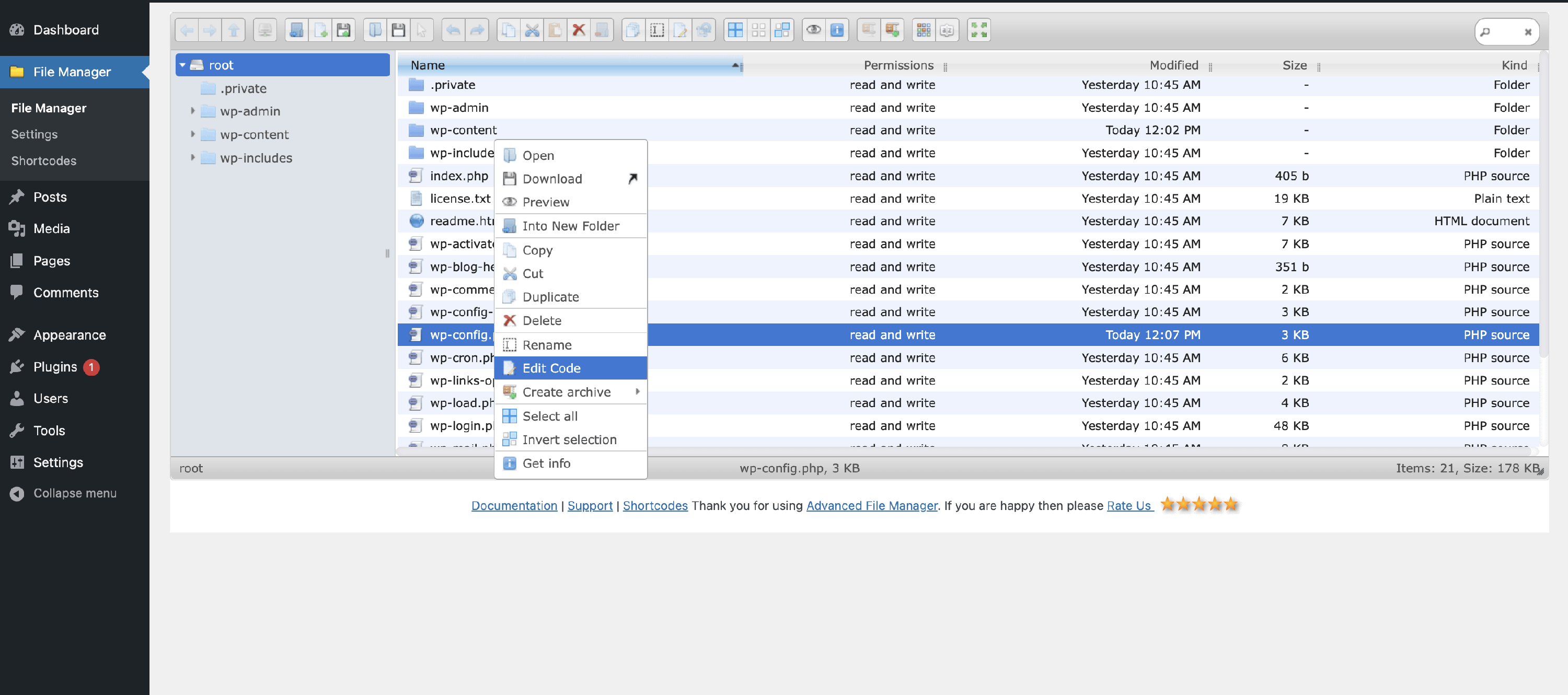 2 Right-click on the wp-config.php file and click on Edit Code.