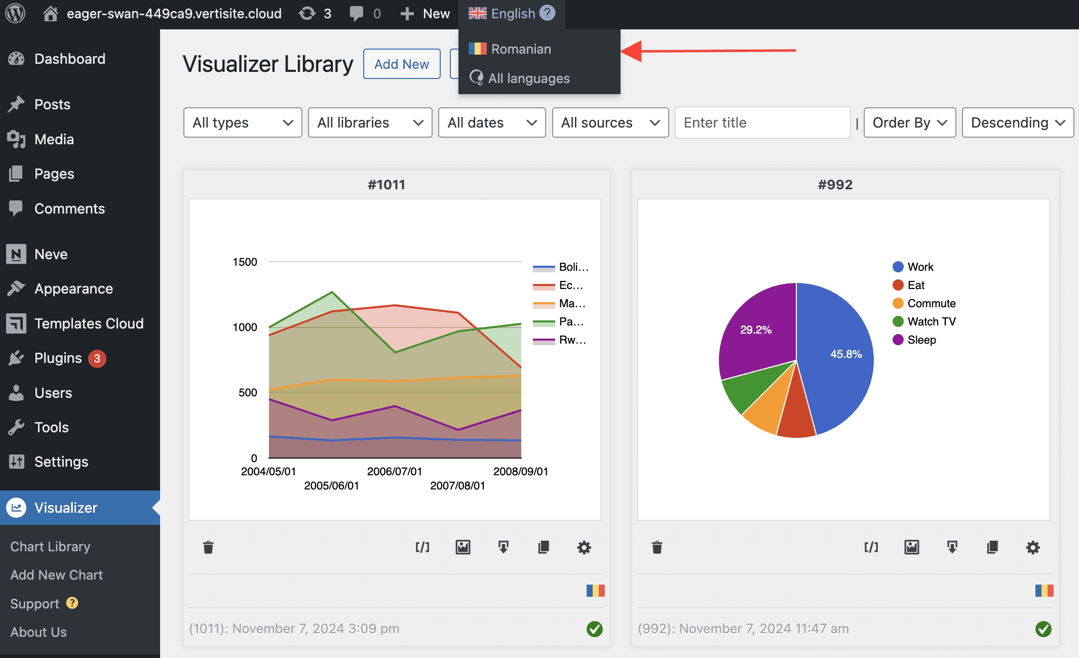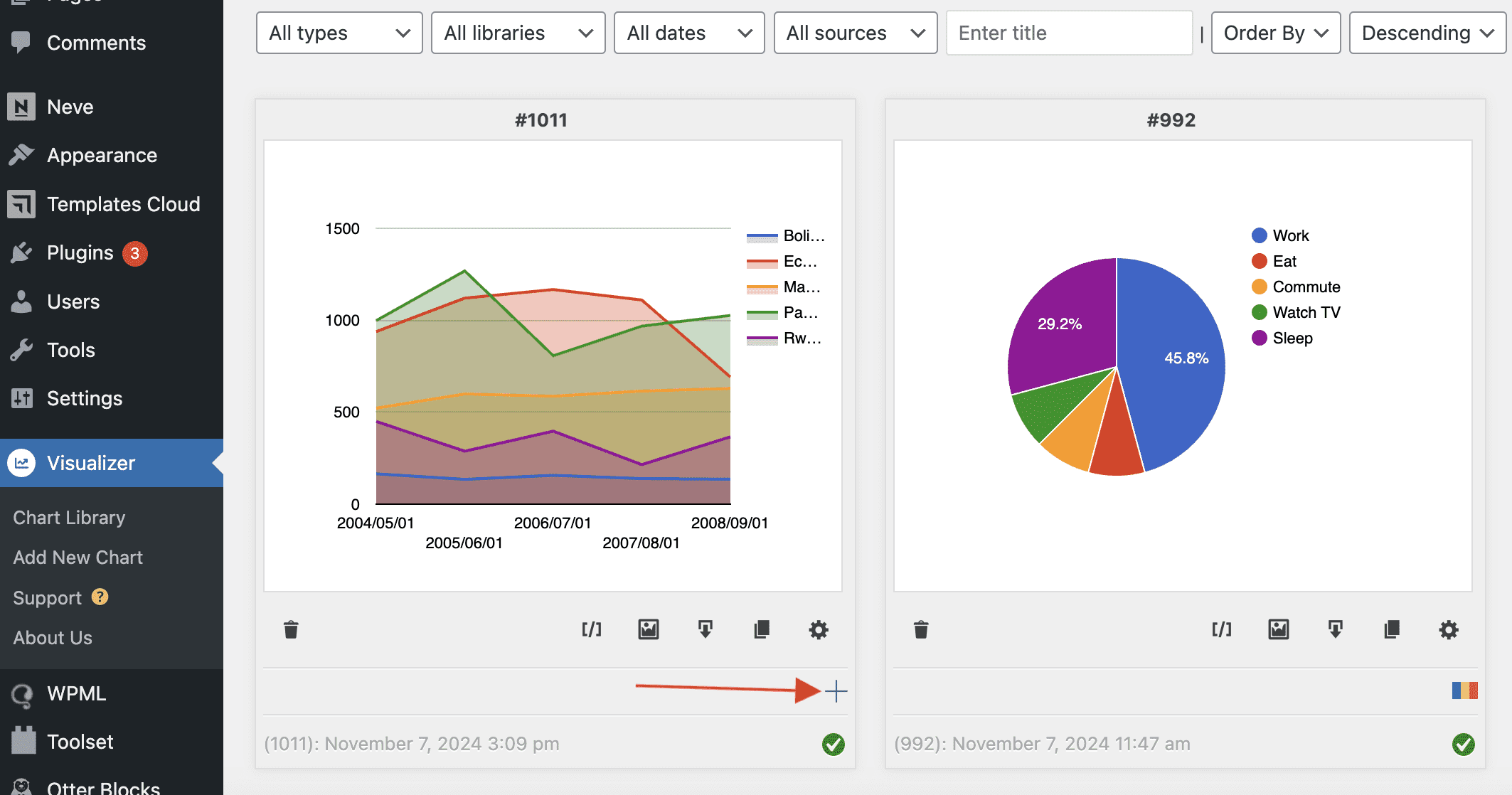 3. Navigate to Visualizer > Charts Library and click on the + button to translate a chart in the other language of your site.