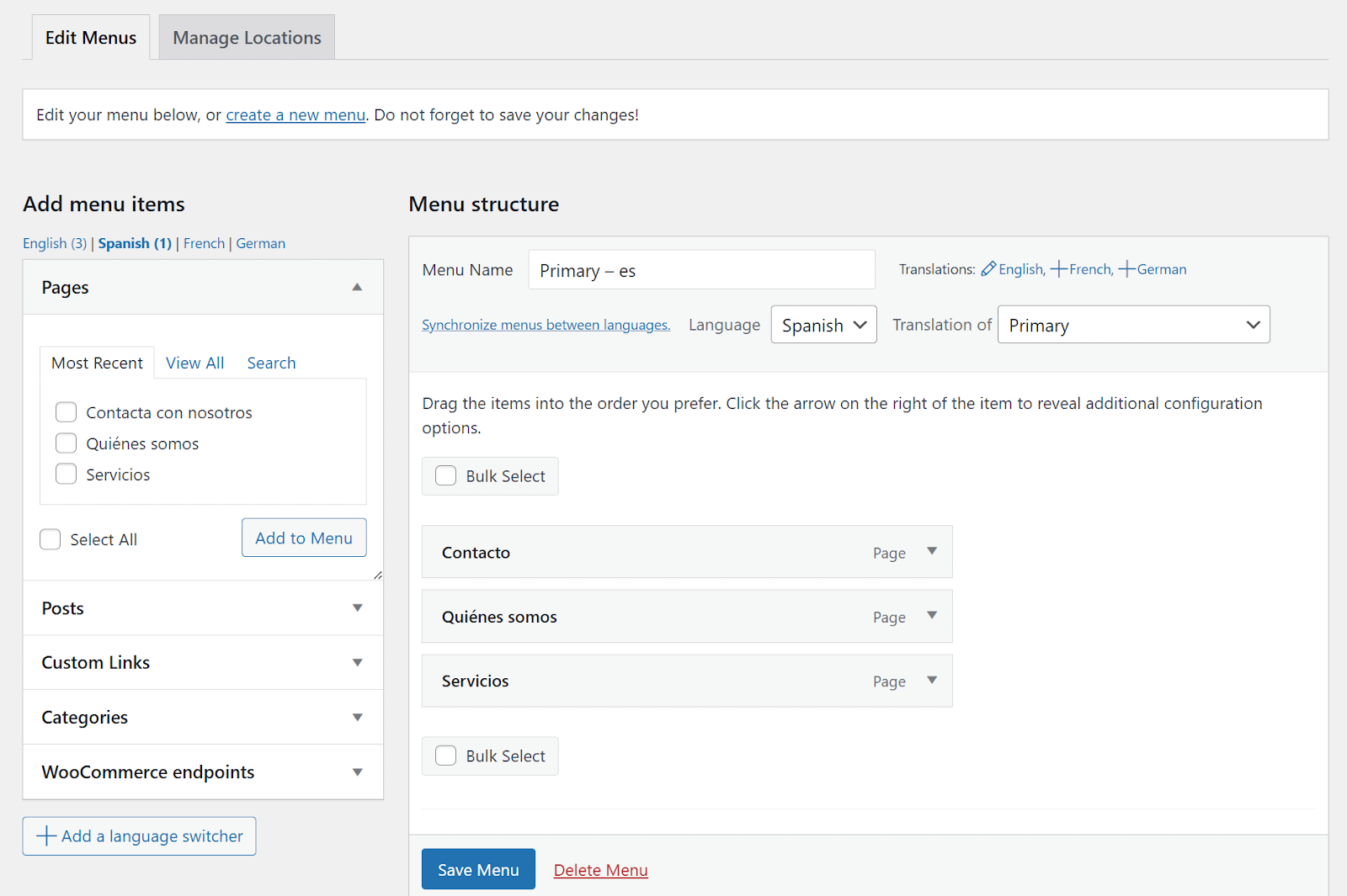 Spanish Menu Translation in WPML