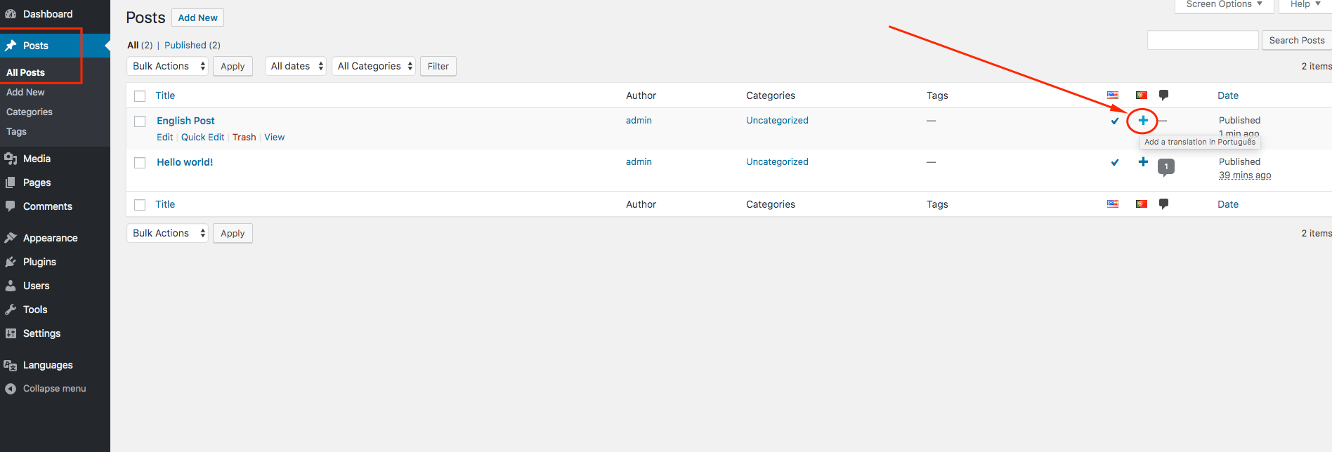 To translate a post, navigate to the WordPress Dashboard > Posts, find your post, and click on the plus sign corresponding to the language that needs a translation.
