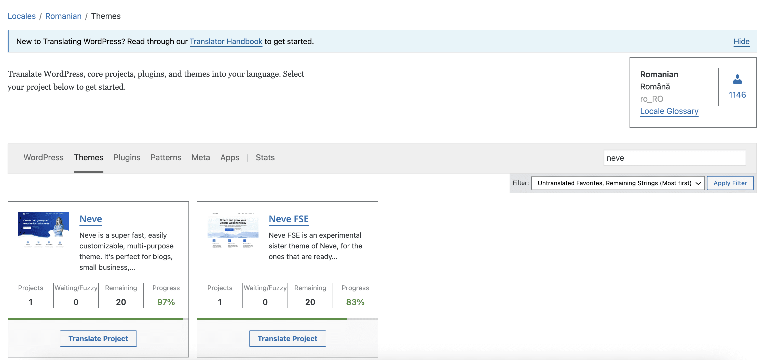 Step 3. Navigate to the Themes or Plugins tab ( depending on which product you want to translate ) and search for the project of your choice. In this case, it's the Neve theme.