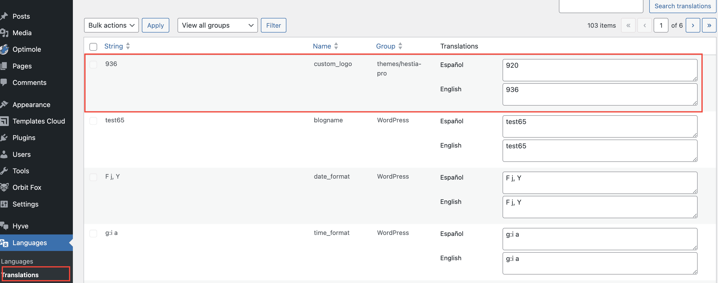 - Go to Dashboard > Languages > Translations. Locate the custom_logo option. You will notice there the ID of the media file uploaded for the logo.