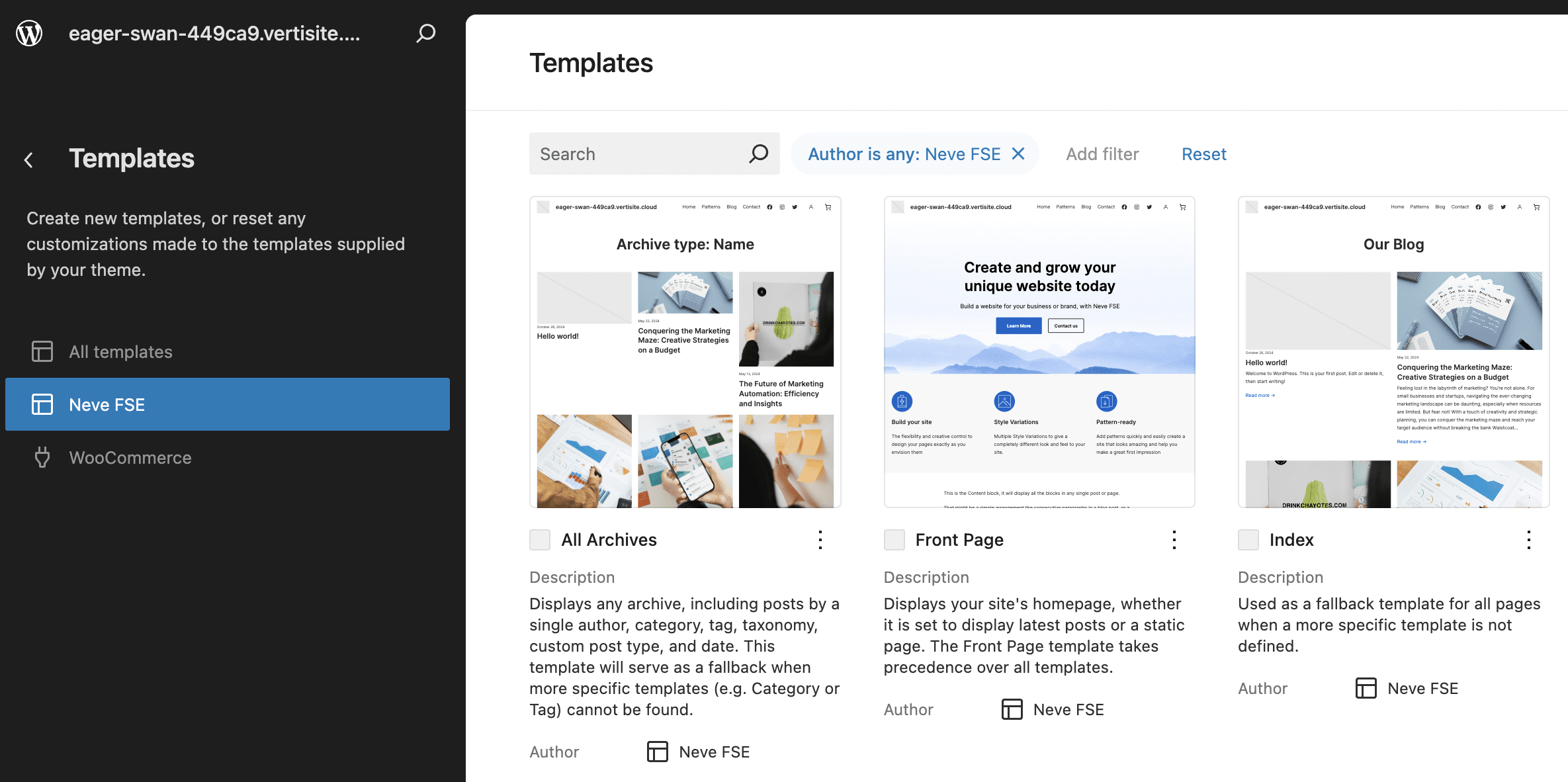 The list of templates shipped with Neve FSE
