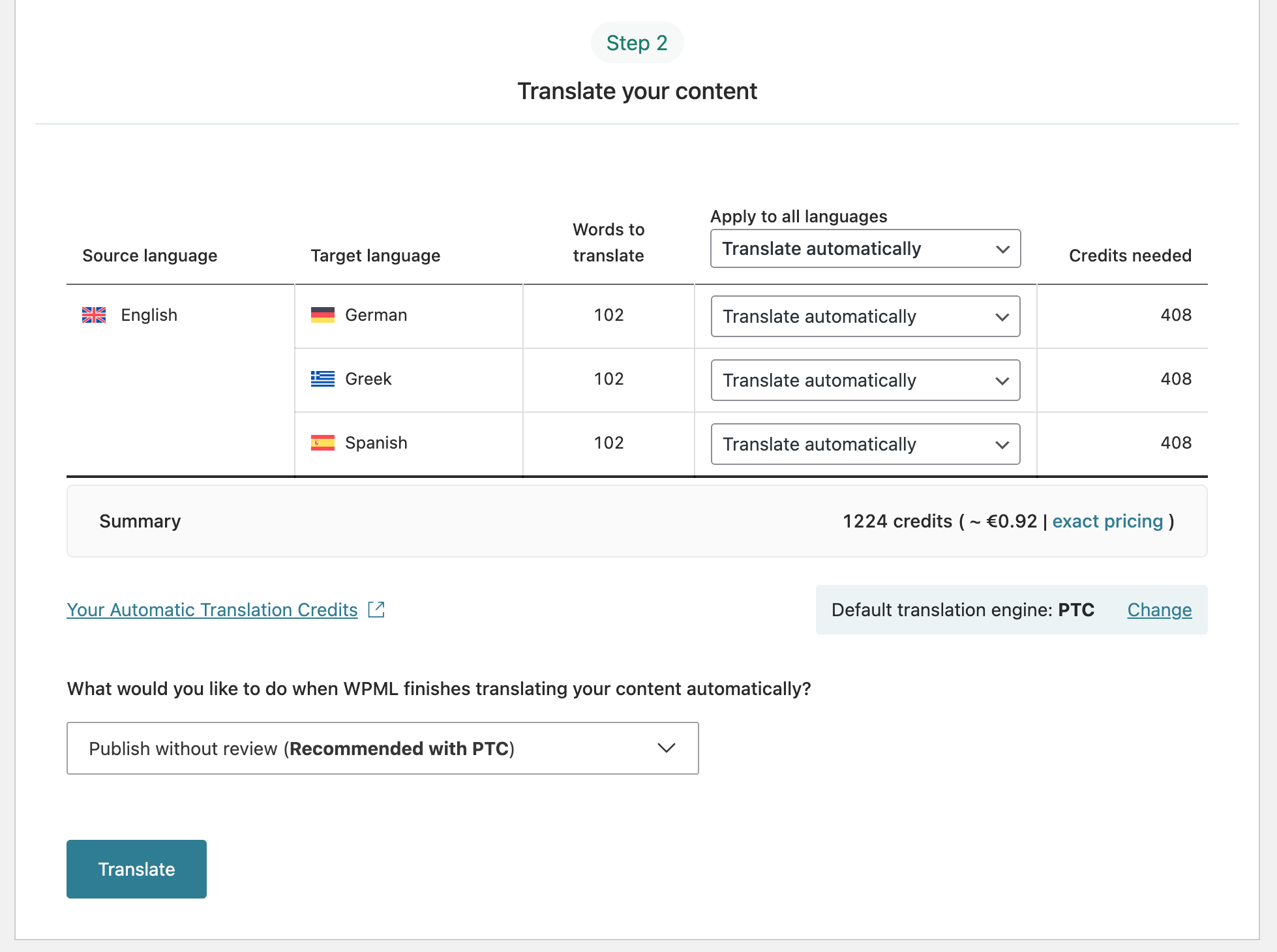 Before sending content for automatic translation, check how many credits you’ll spend and their cost, and click Translate.