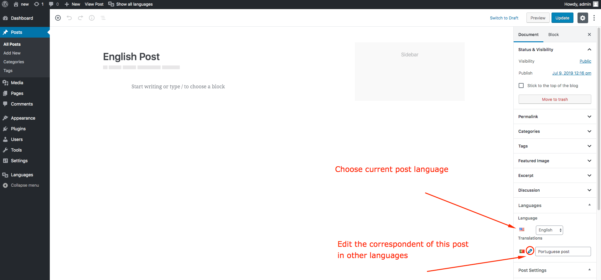 Editing the post language can also be done while editing the post.
