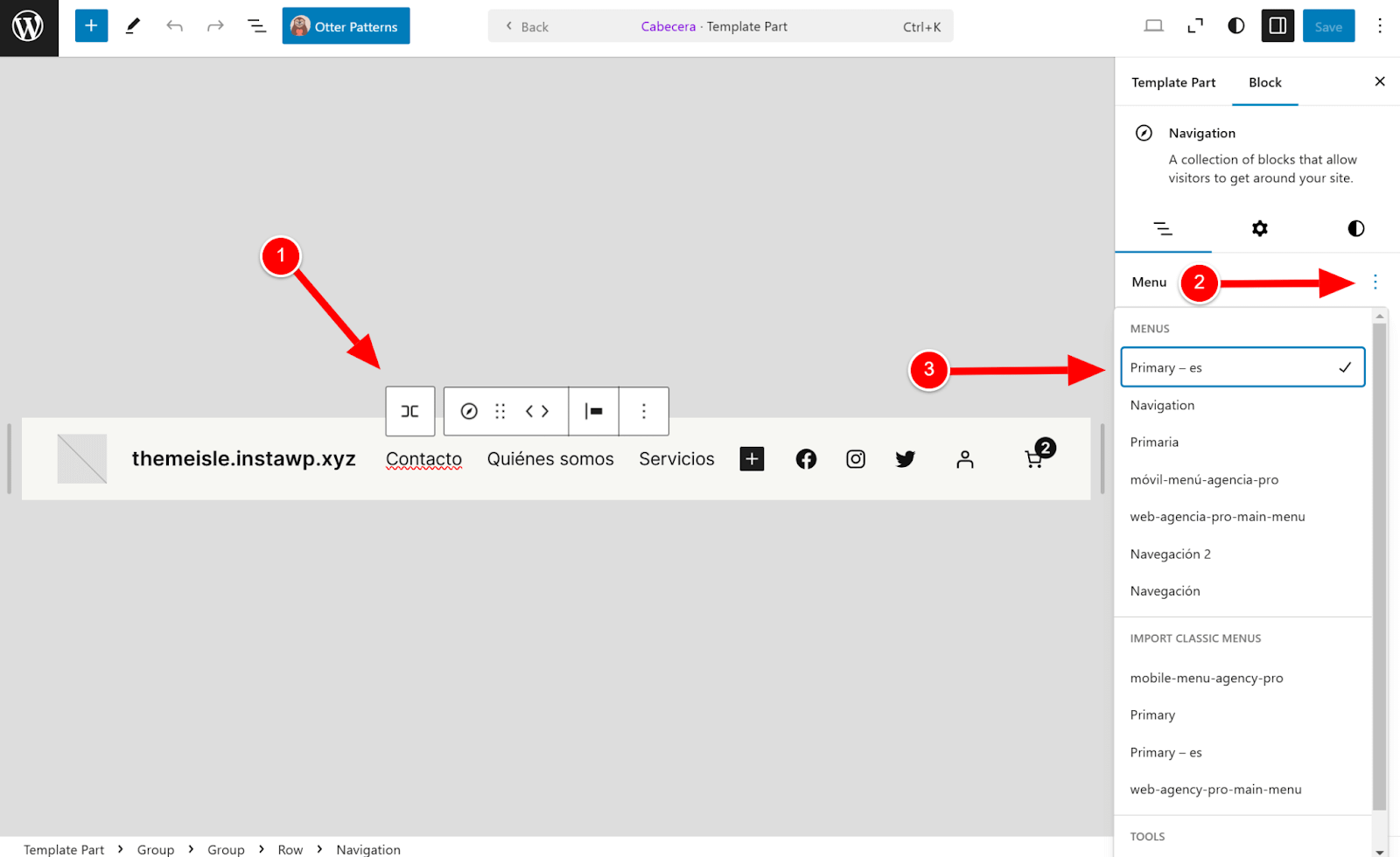 - Once done, go directly to Appearance > Editor and click your Header. Edit the existing navigation block, set it to your translated menu, and click Save.