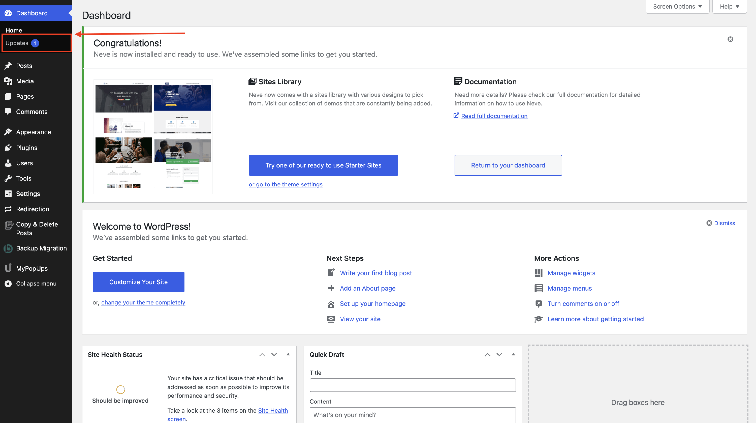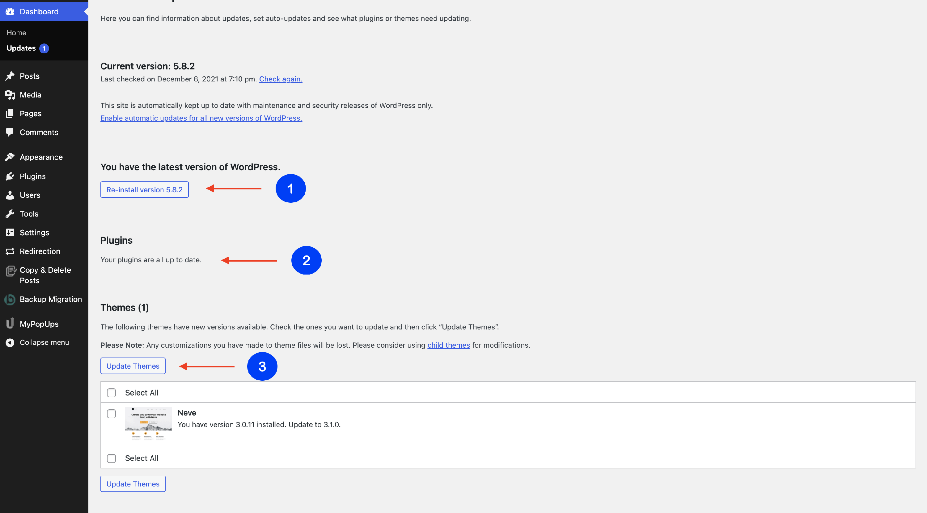 There you will see the current version of WordPress (1), the status of the plugins (2), and the status of the themes (3):