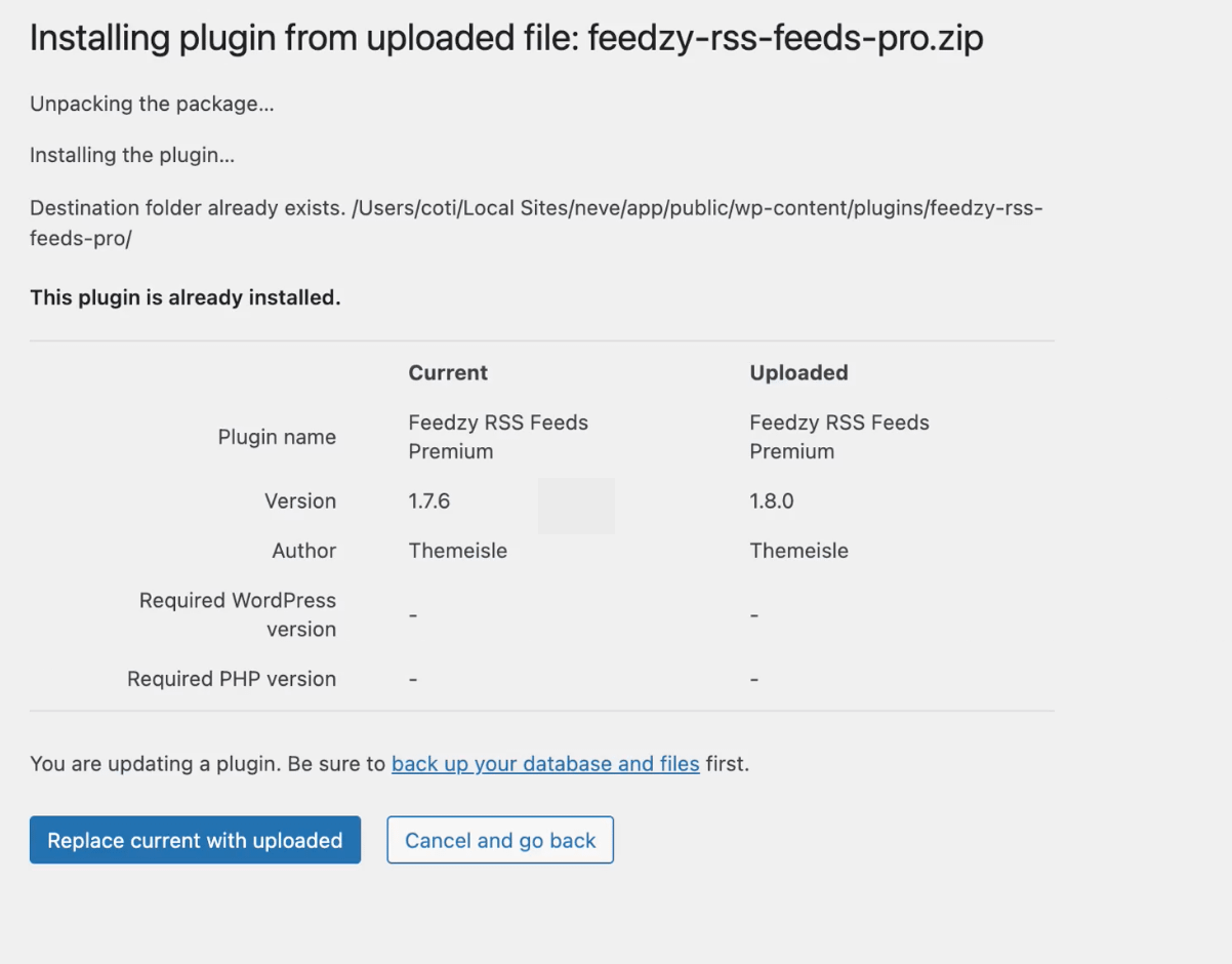 After clicking on the install button, you will be redirected to a page that asks you if you want to replace the current version with the one installed.