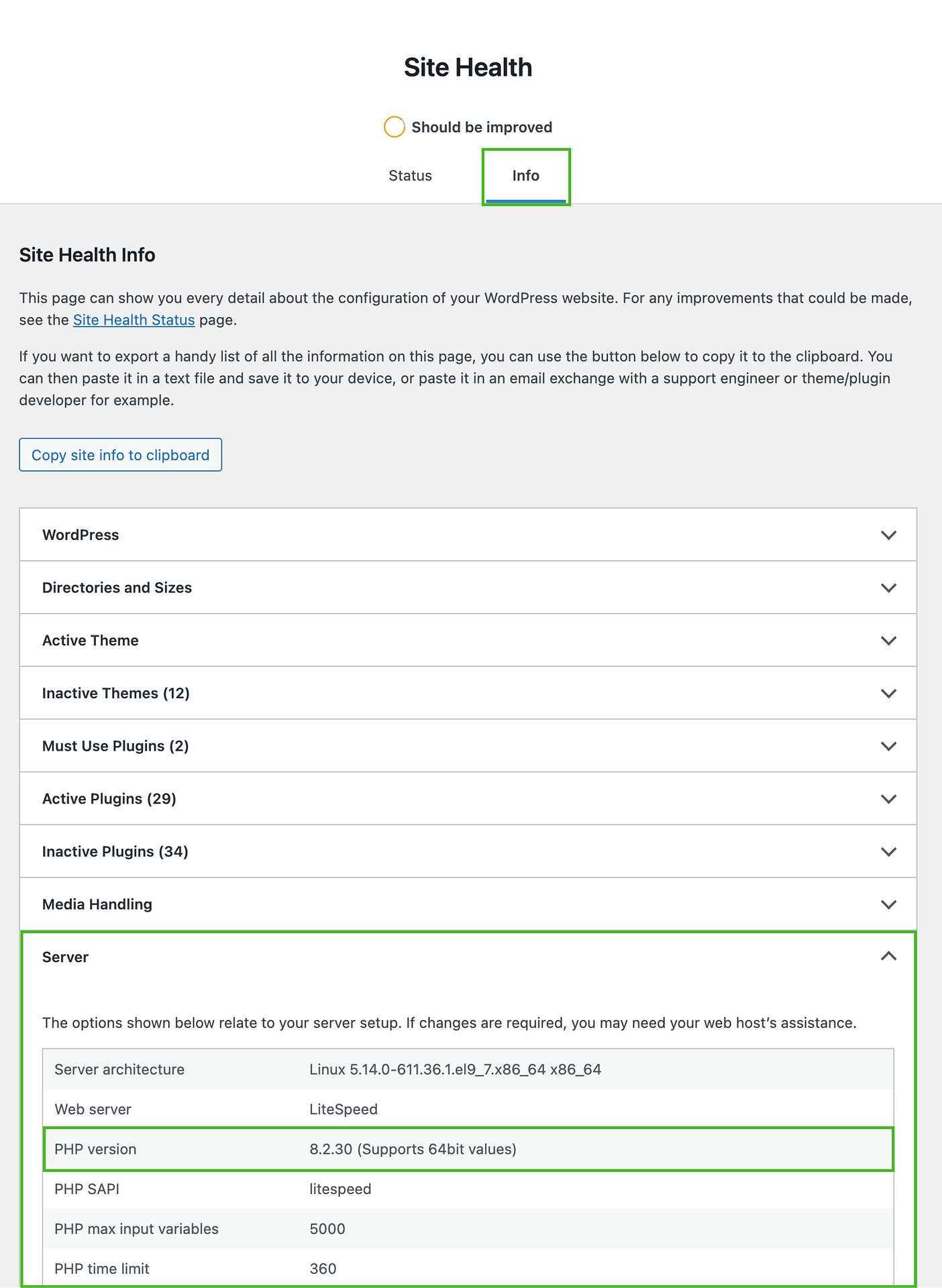 - Verify the upgrade in Site Health. Go to Tools > Site Health > Info > Server again and confirm the PHP version now shows the updated version.