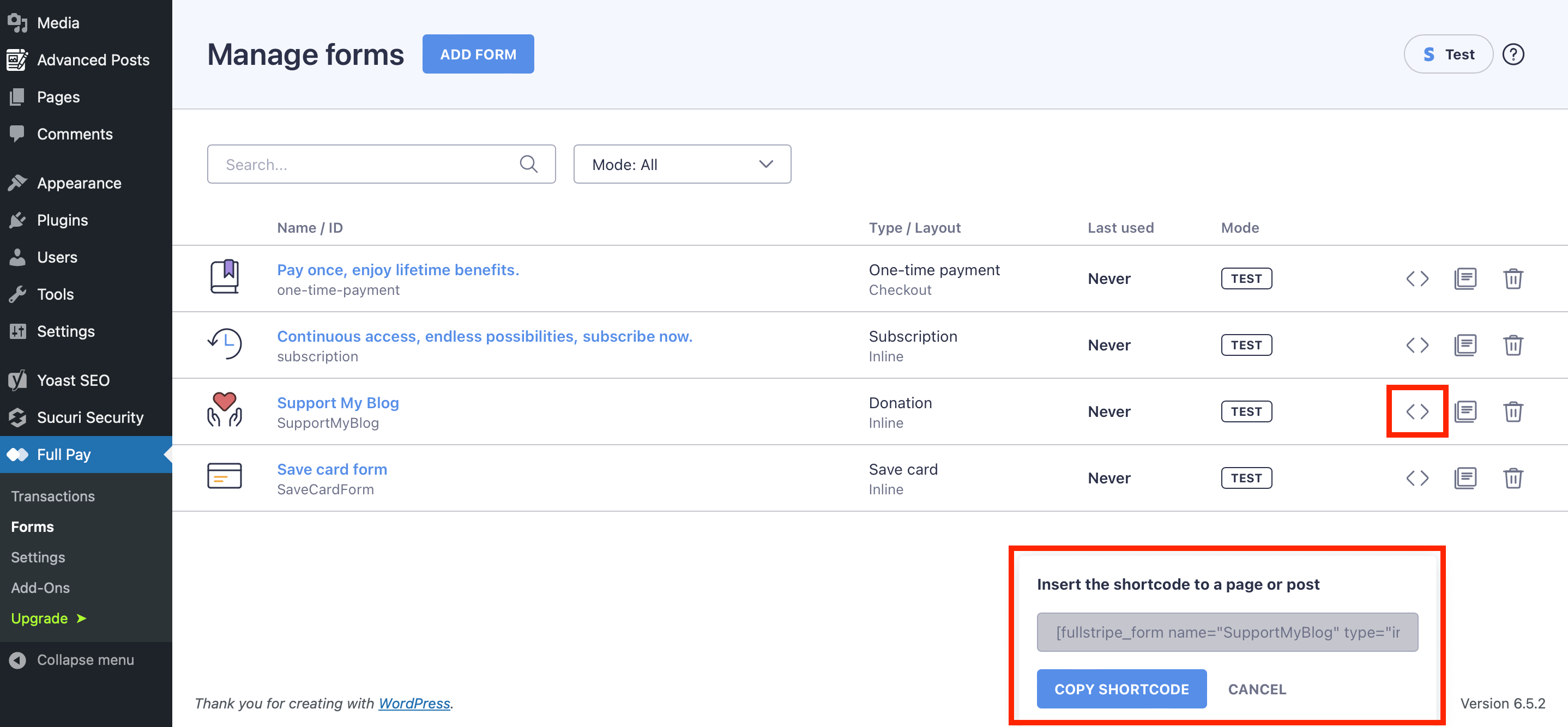 You can download WP Full Pay plugin for free, create the forms and test Stripe transactions on your WordPress site.