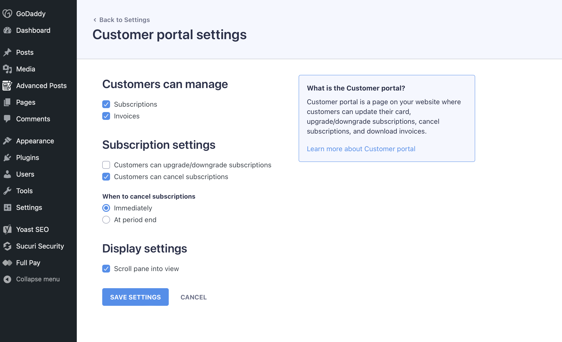 The 'Customer Portal Settings' is an area where you can manage the permissions and controls your your subscribers, members, and donors have over their subscriptions and invoices.