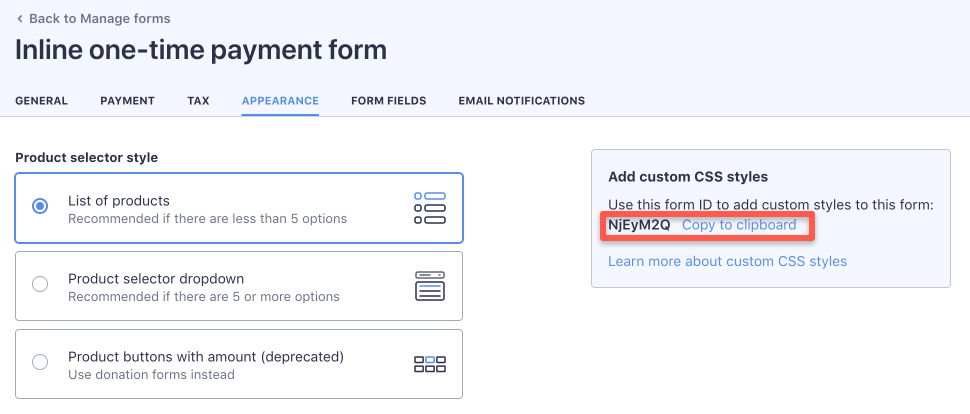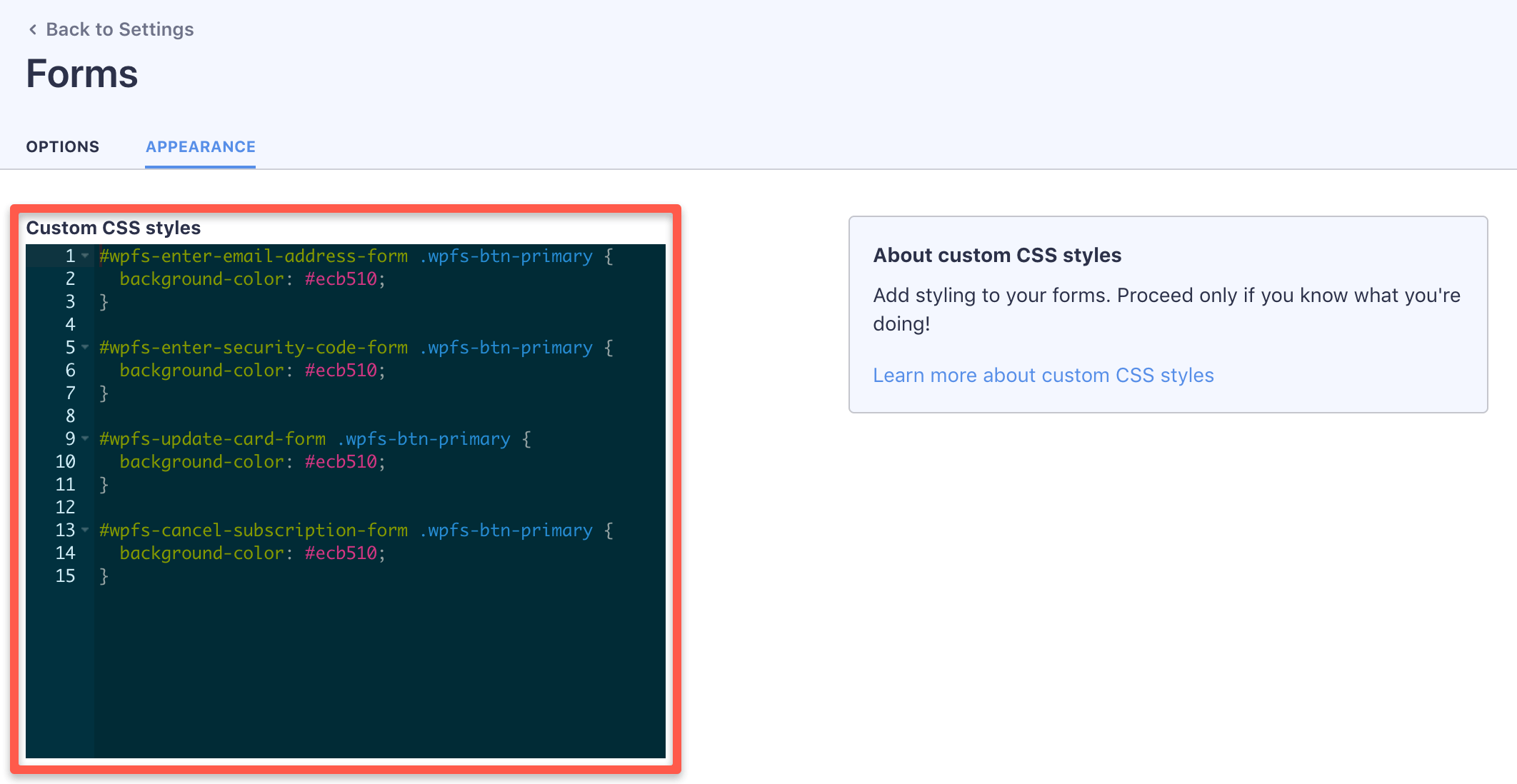 If you’d like to add styles to a form then you’d need the ID of the form in question.