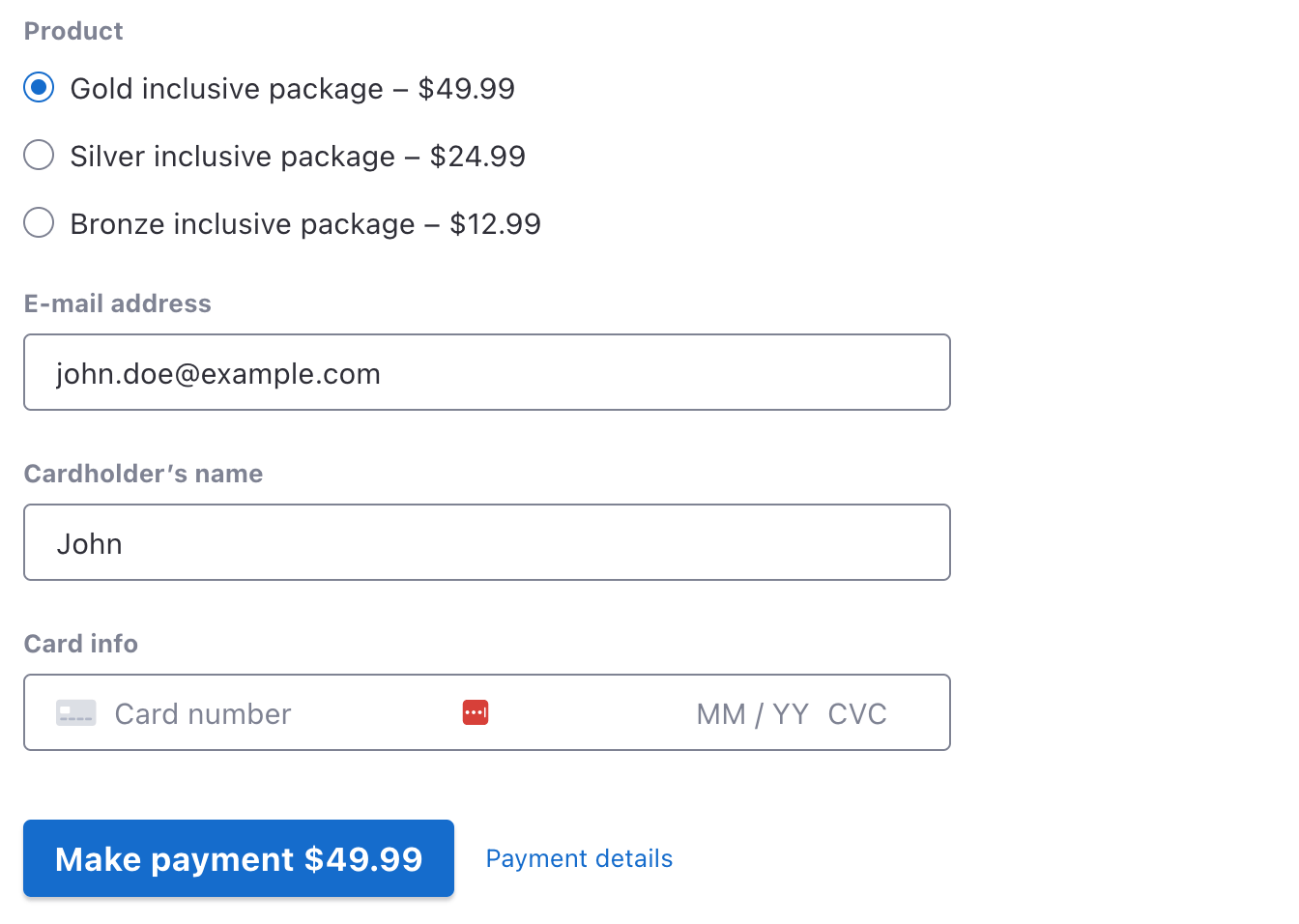 - A payment flow starts with user registration, then it lets the customer enter order-specific data on the next page, and finally the payment form is on the last page with email address and cardholder’s name prefilled.