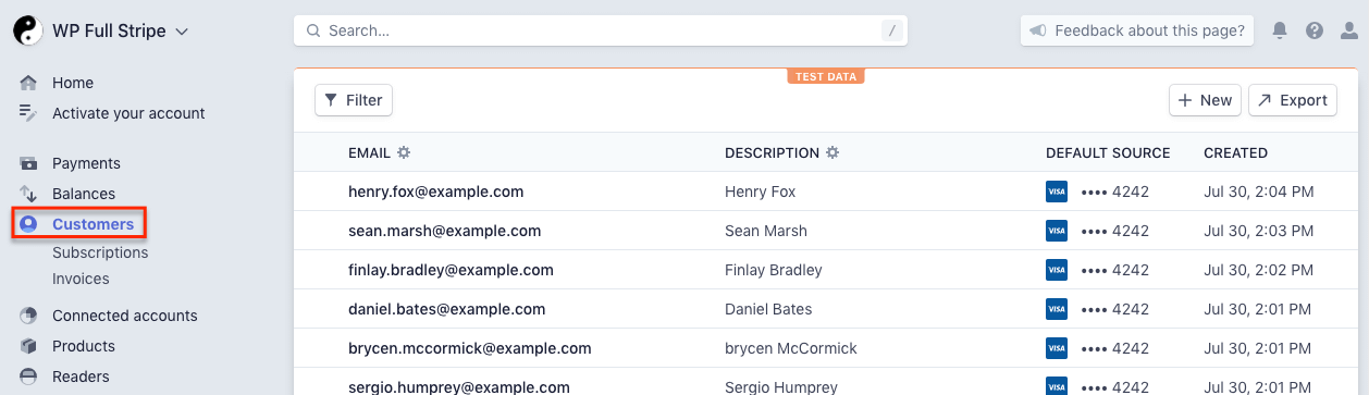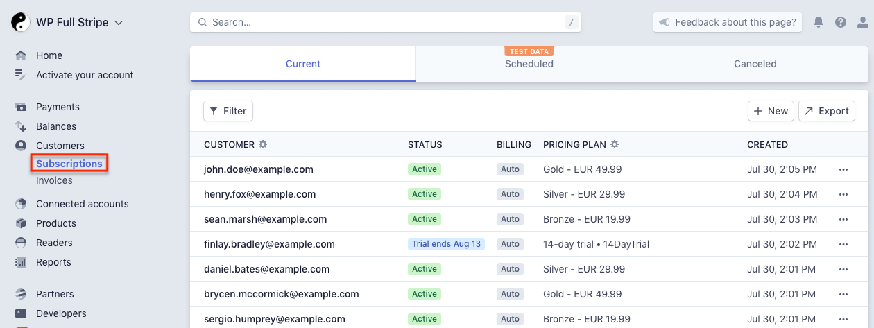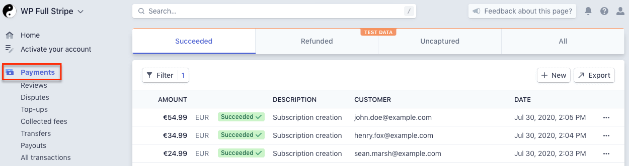 Subscription forms create Stripe subscriptions, you can find them on the “Customers / Subscriptions” page on the Stripe dashboard: