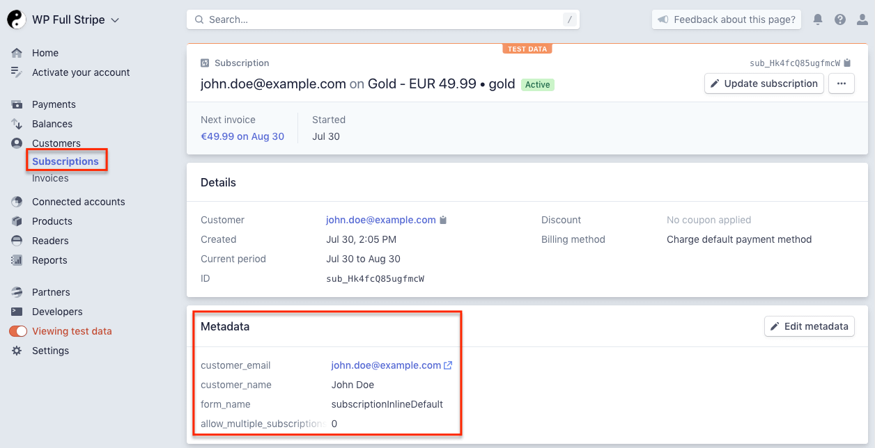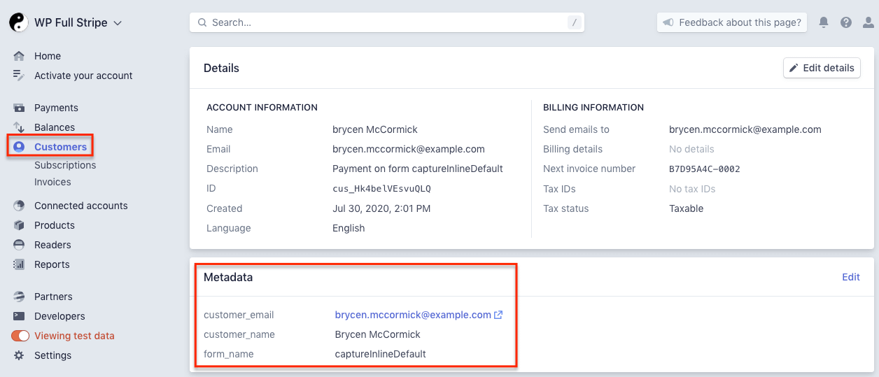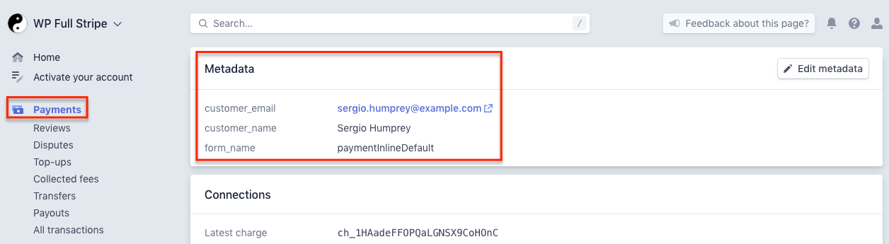 If you’ve configured custom fields on your form, custom fields are saved as metadata, and you can view them on the Stripe dashboard.